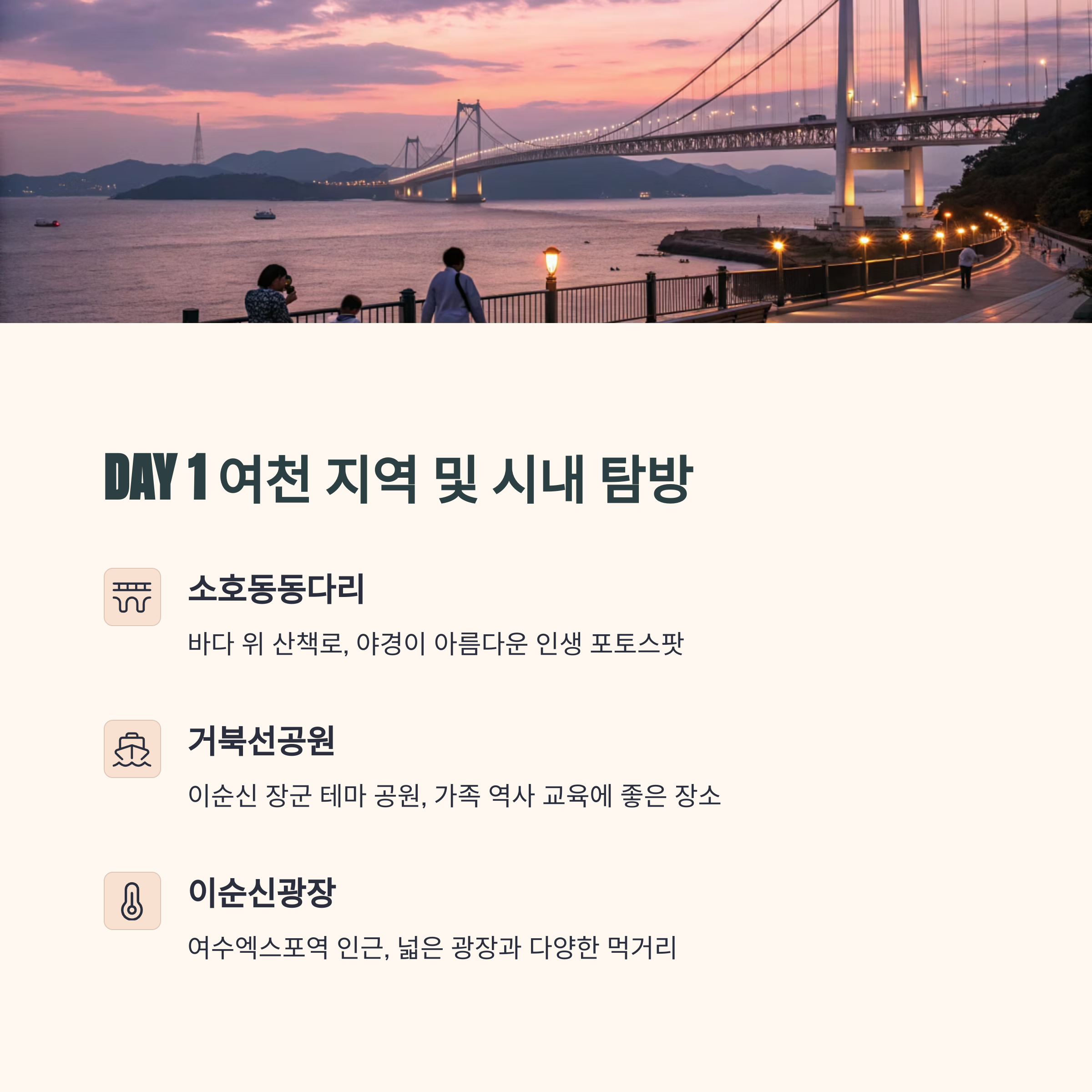 첫째 날 여정에서는 여천 지역과 여수엑스포역 주변 명소를 둘러볼 예정입니다.