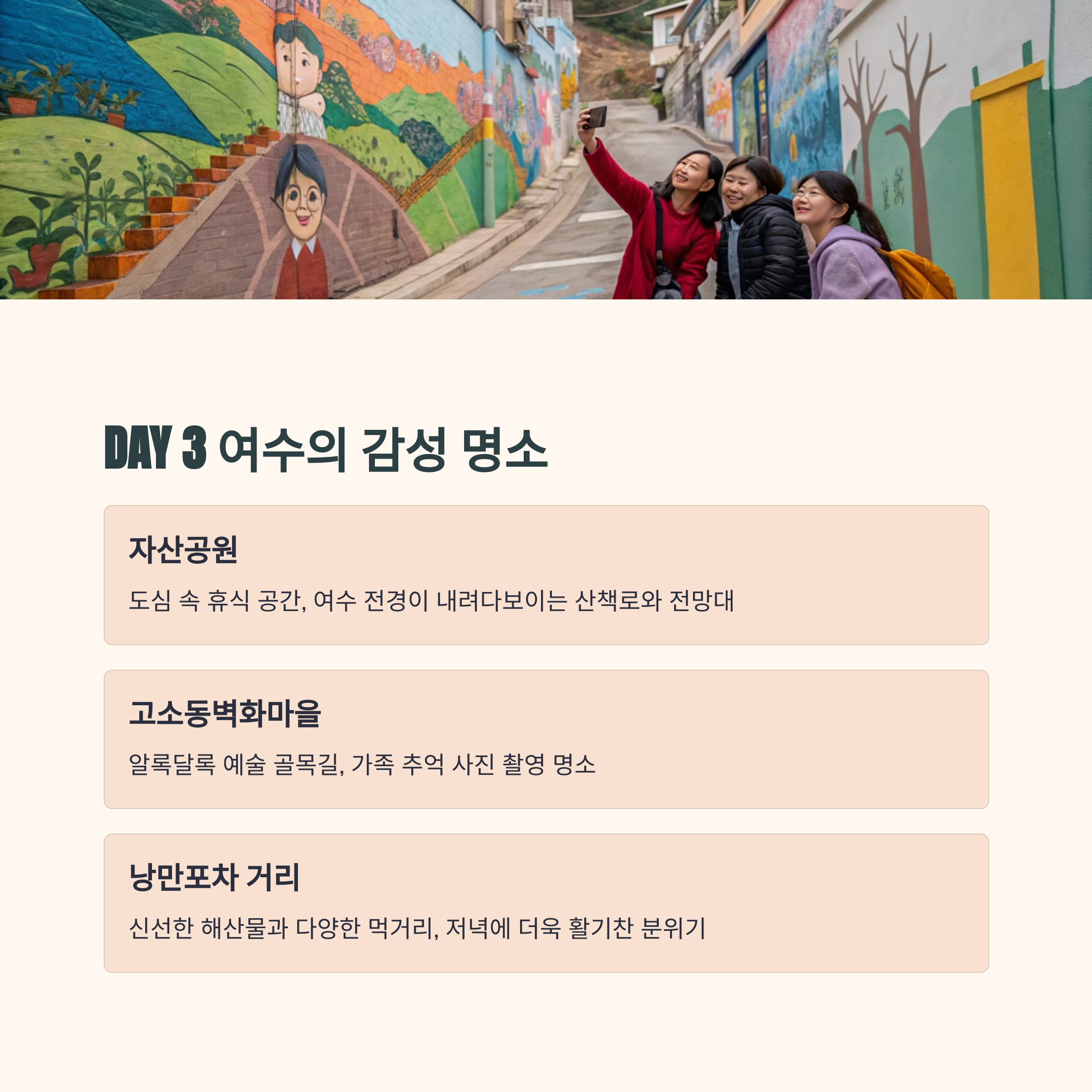 2박 3일 일정을 통해 여수의 자연, 역사, 액티비티를 균형 있게 체험할 수 있습니다.