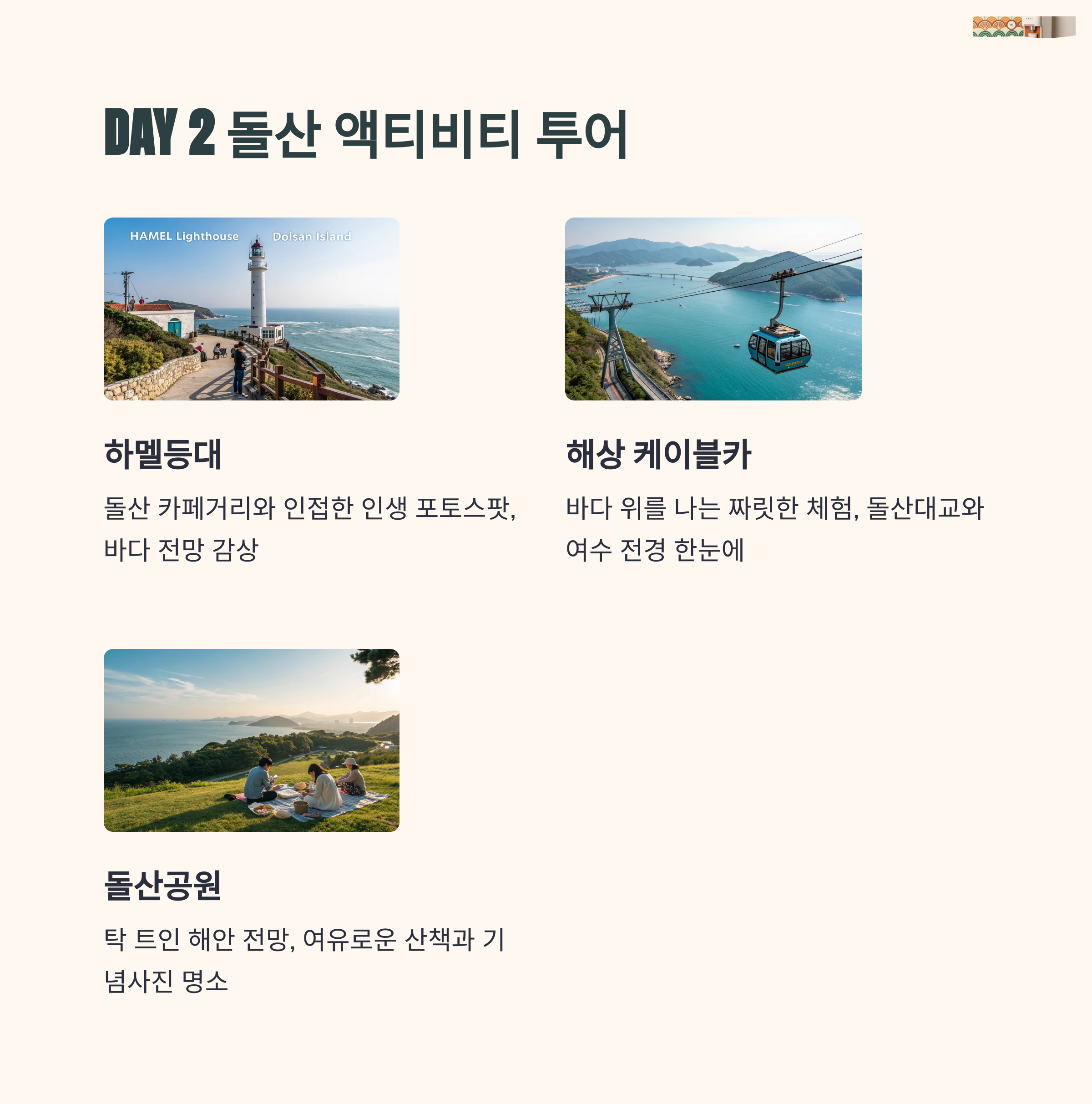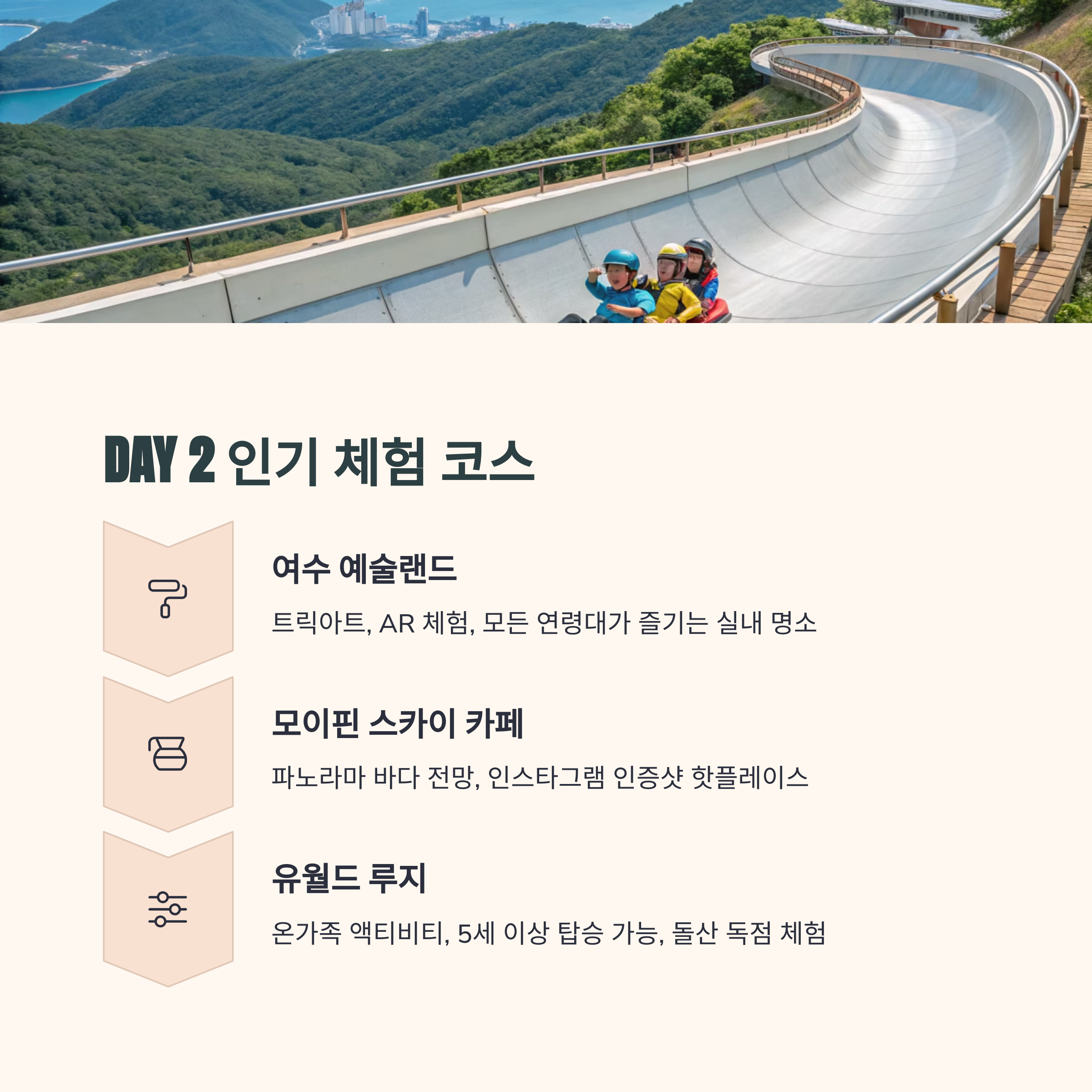 둘째 날에는 돌산섬 일대로 이동하여 해상 케이블카와 여수 예술랜드, 루지 체험까지 알차게 여행을 채울 수 있습니다.