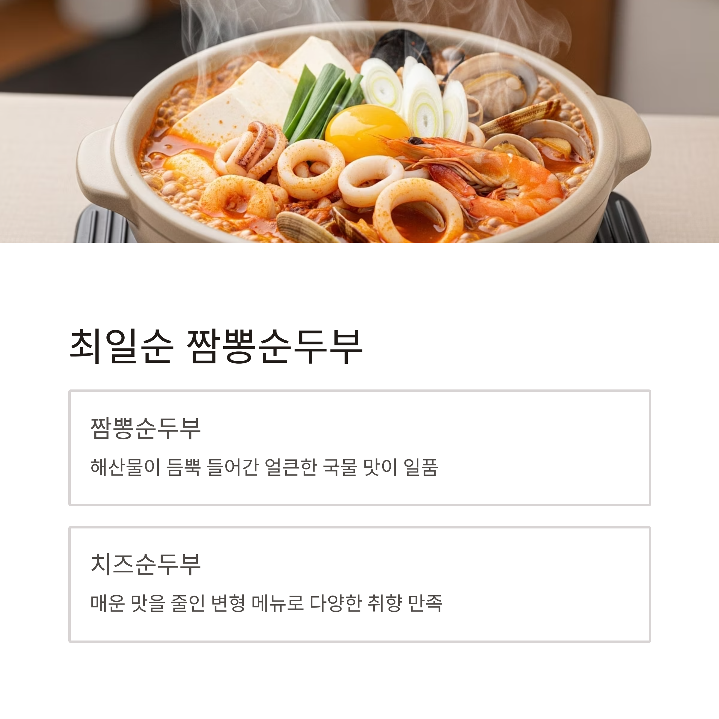 짬뽕과 순두부가 만난 얼큰한 국물 맛이 일품입니다.