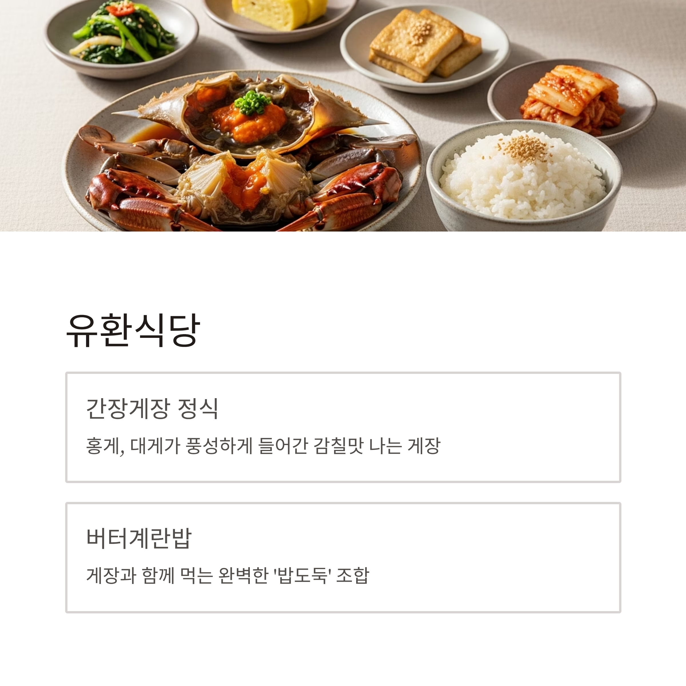 | 유환식당 | 간장게장 정식, 홍게라면 | 경포대 인근 | 게장 + 라면 코스, 진한 간장 맛 |
