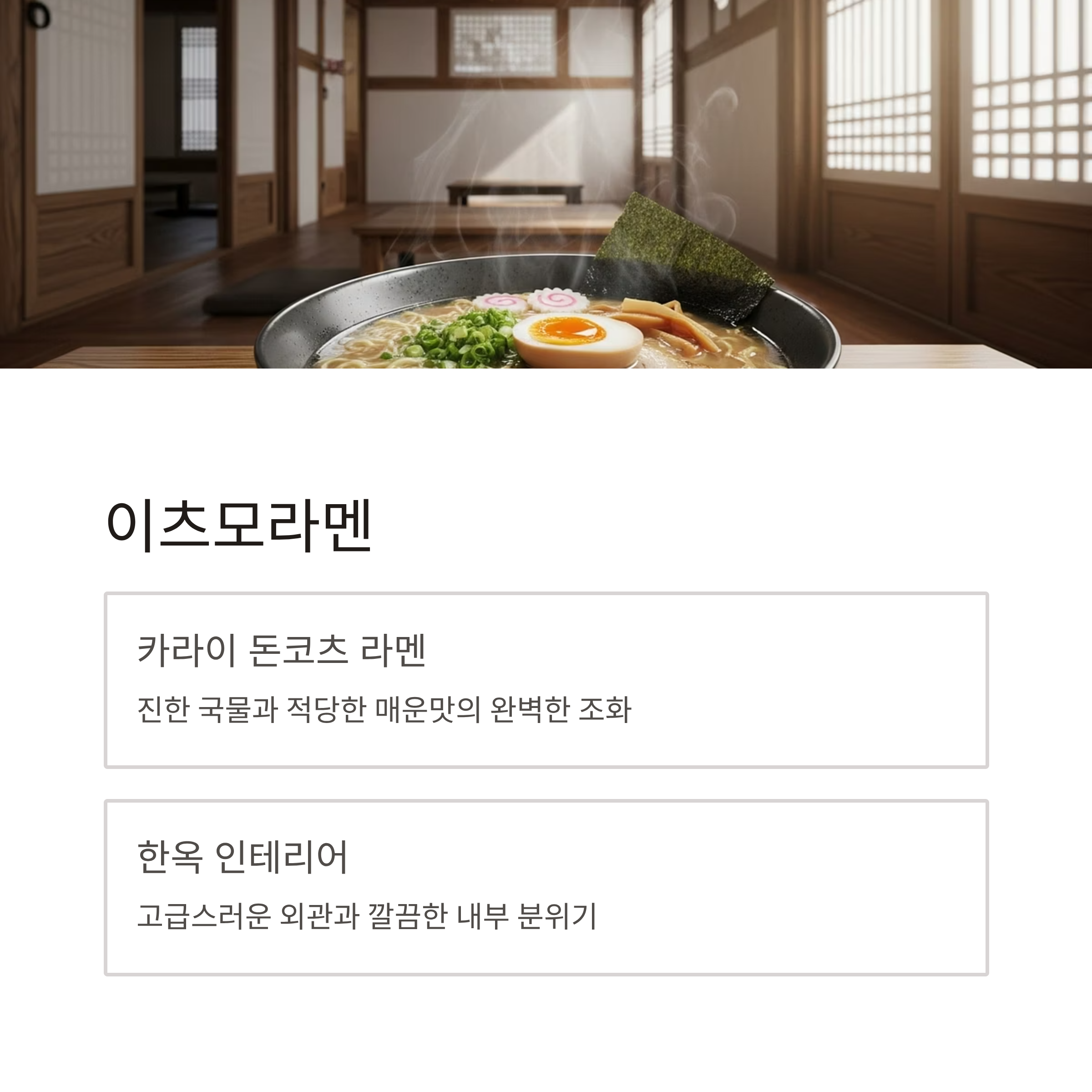 | 이츠모라멘 | 돈코츠 라멘, 츠케멘 | 한옥 개조 라멘집 | 고급스러운 분위기, 정통 라멘 맛 |