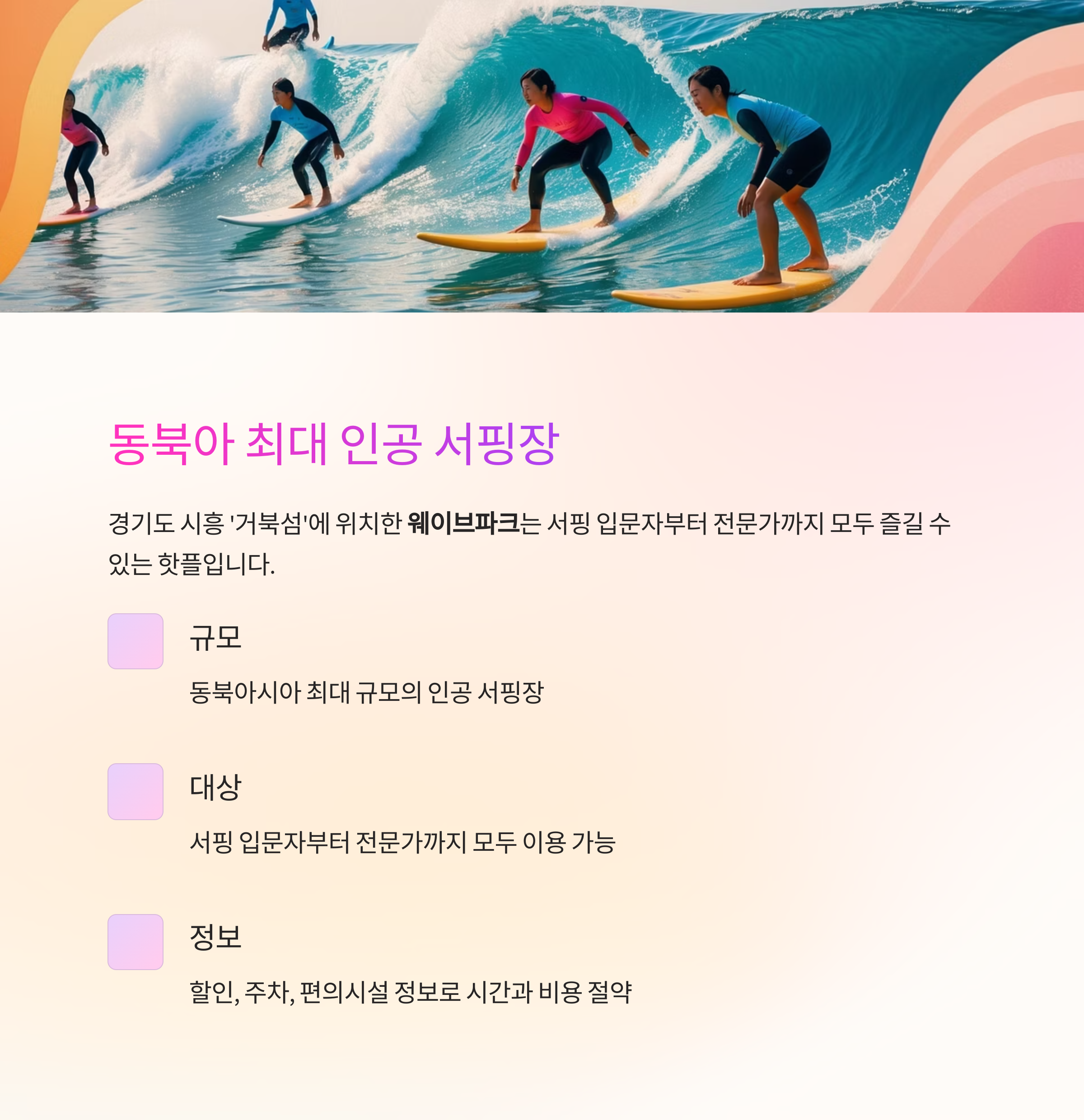 - 입장권 종류: 입장권 / 서핑 체험권 / 종일권 / 강습권 등 다양