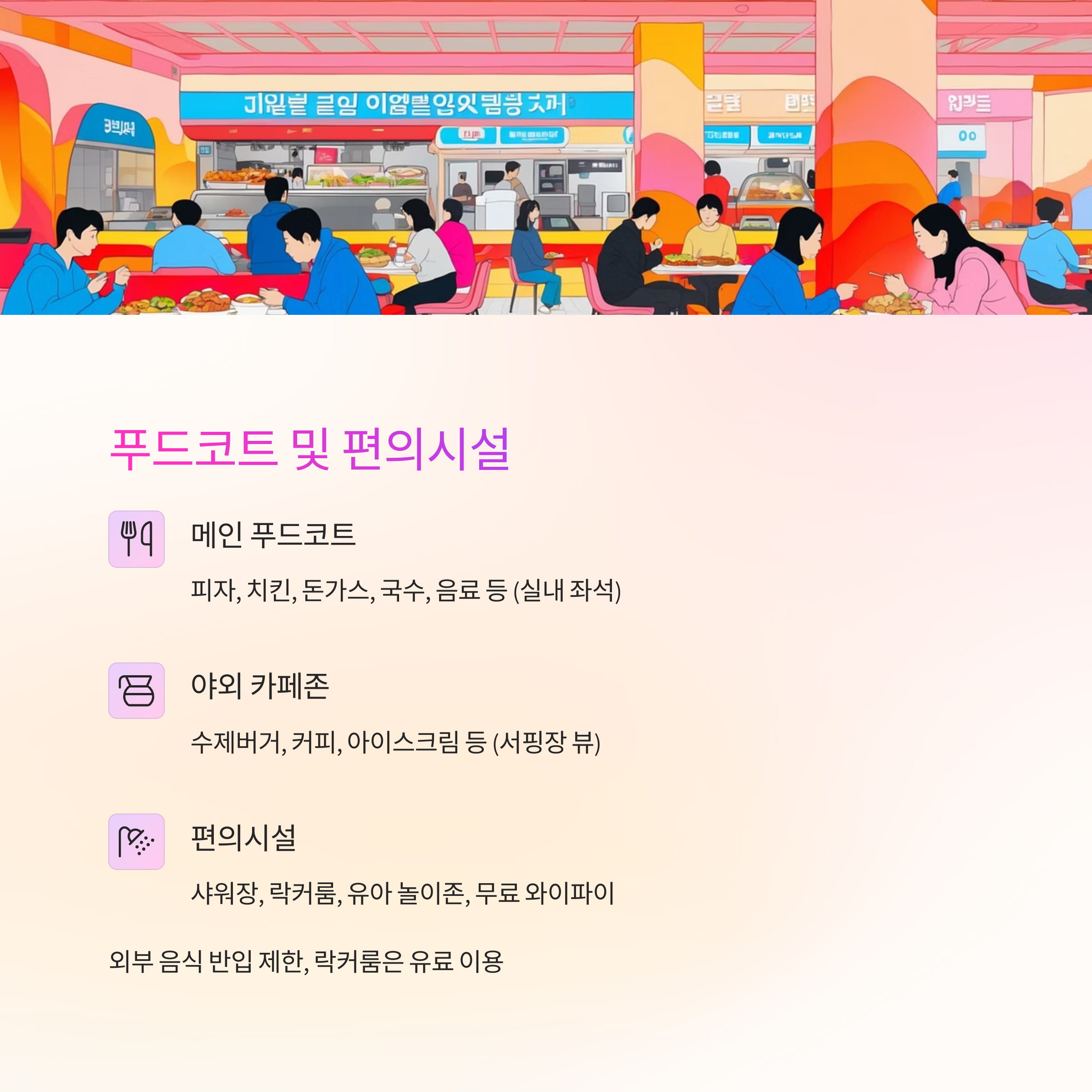 푸드코트는 외부 음식 반입 제한되므로 간식류는 사전 확인 필수