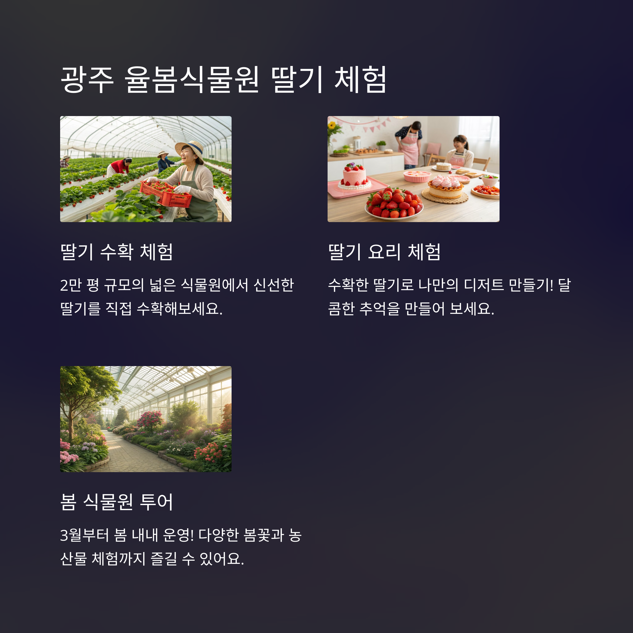 특히 율봄식물원의 딸기 수확 및 요리 체험은 봄철 인기 활동으로 꼽힙니다.