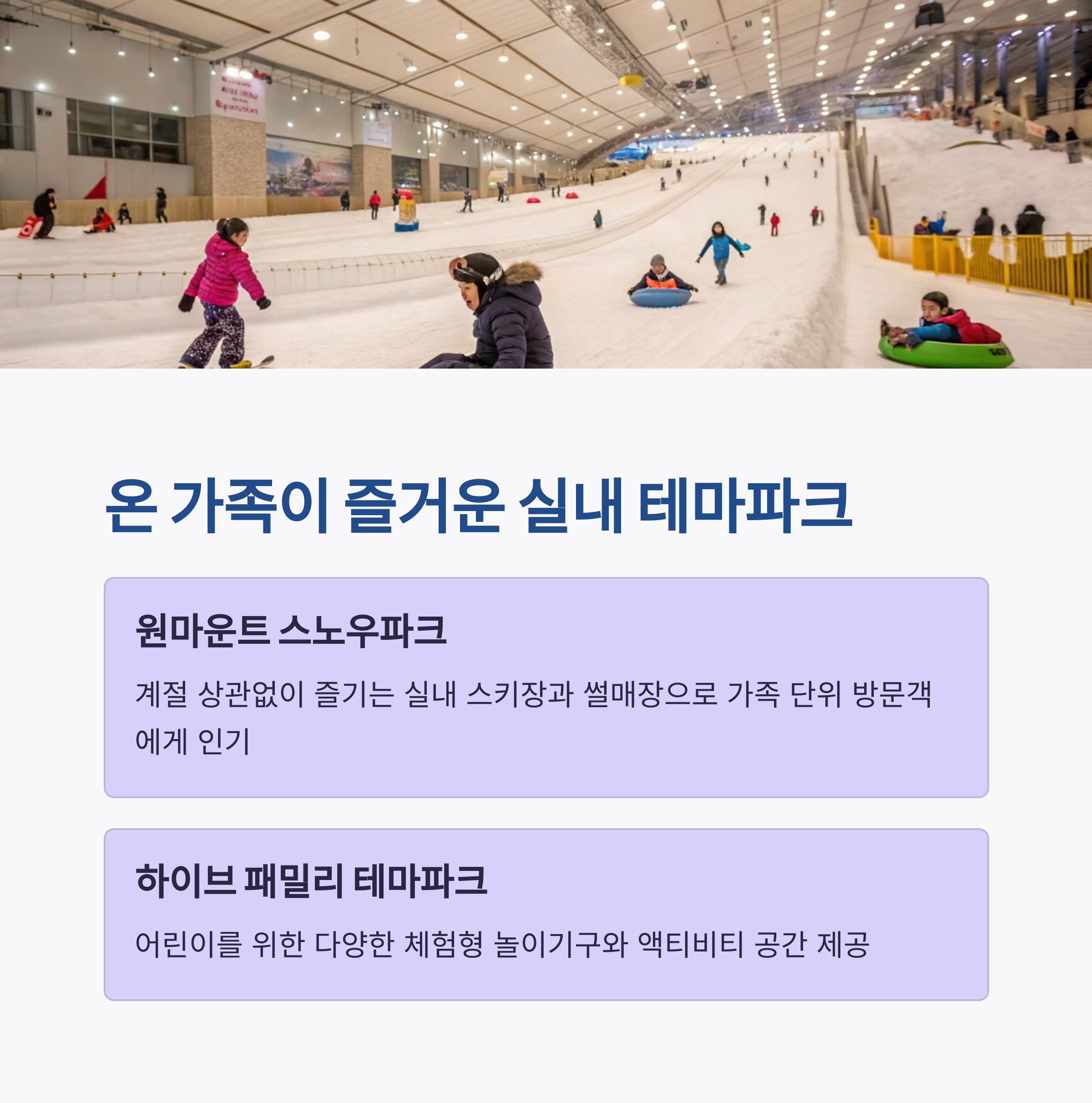 가족 단위 추천 장소로는 원마운트, 하이브 패밀리 테마파크가 우수합니다.