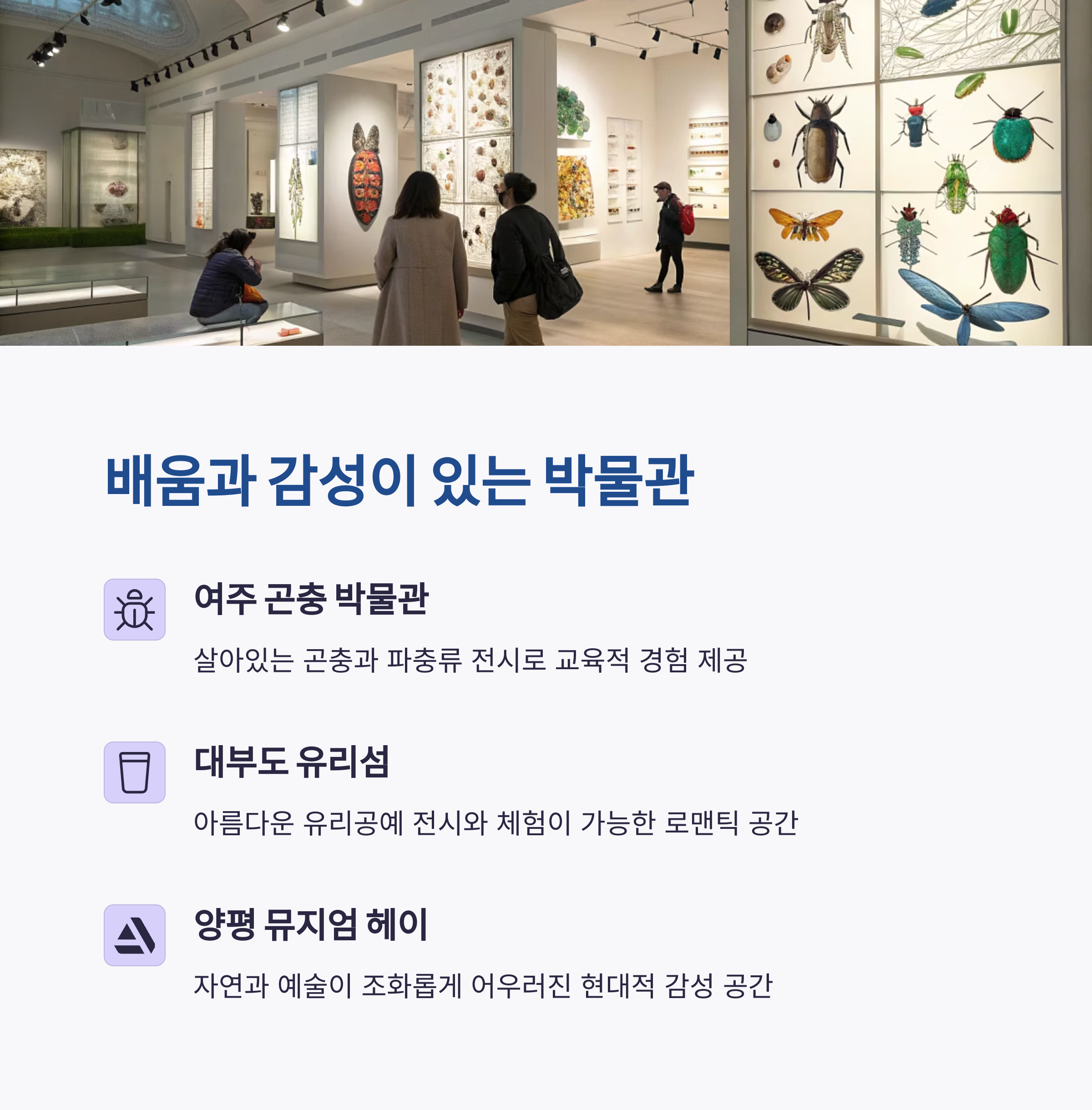 한편, 예술을 좋아한다면 대부도 유리섬 박물관과 같은 장소도 경기도와 인천 인근에서 추천할 만한 명소입니다.