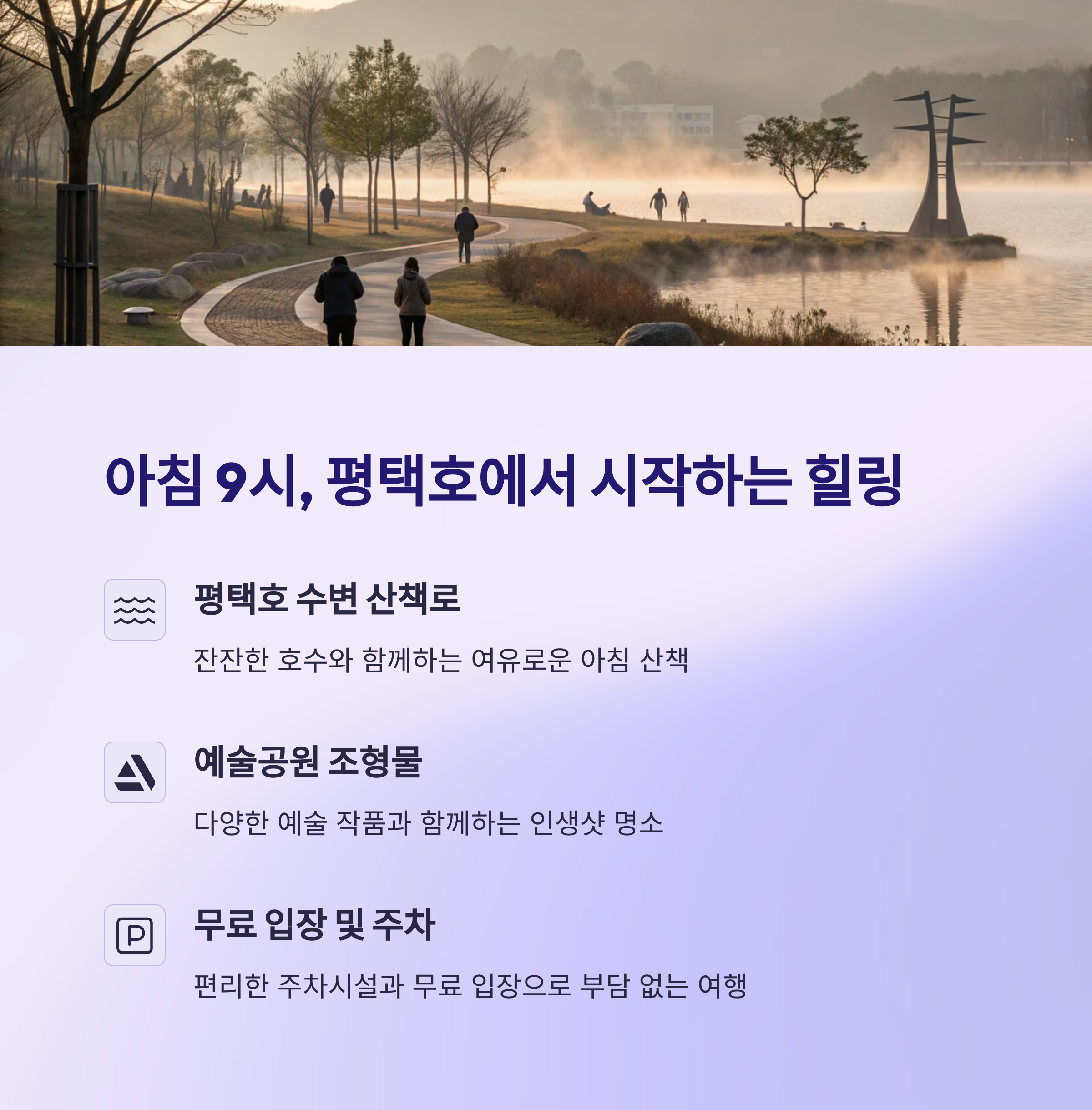 특히 평택호 관광단지는 가족과 연인이 여유롭게 산책하기 좋은 공간으로 손꼽힙니다.