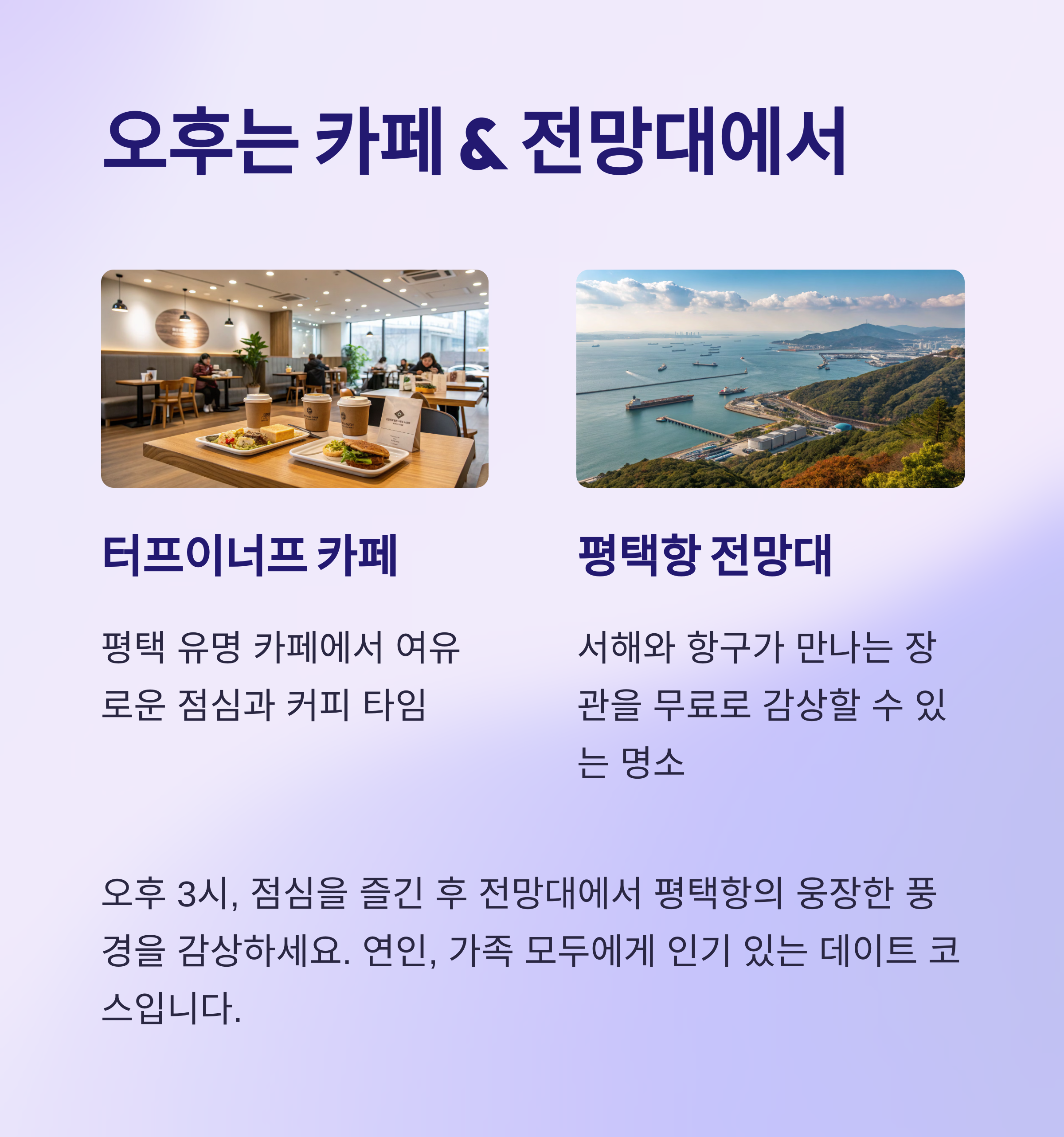 | 오후 3시 | 평택항 전망대 | 서해대교 및 항만 풍경 감상 |