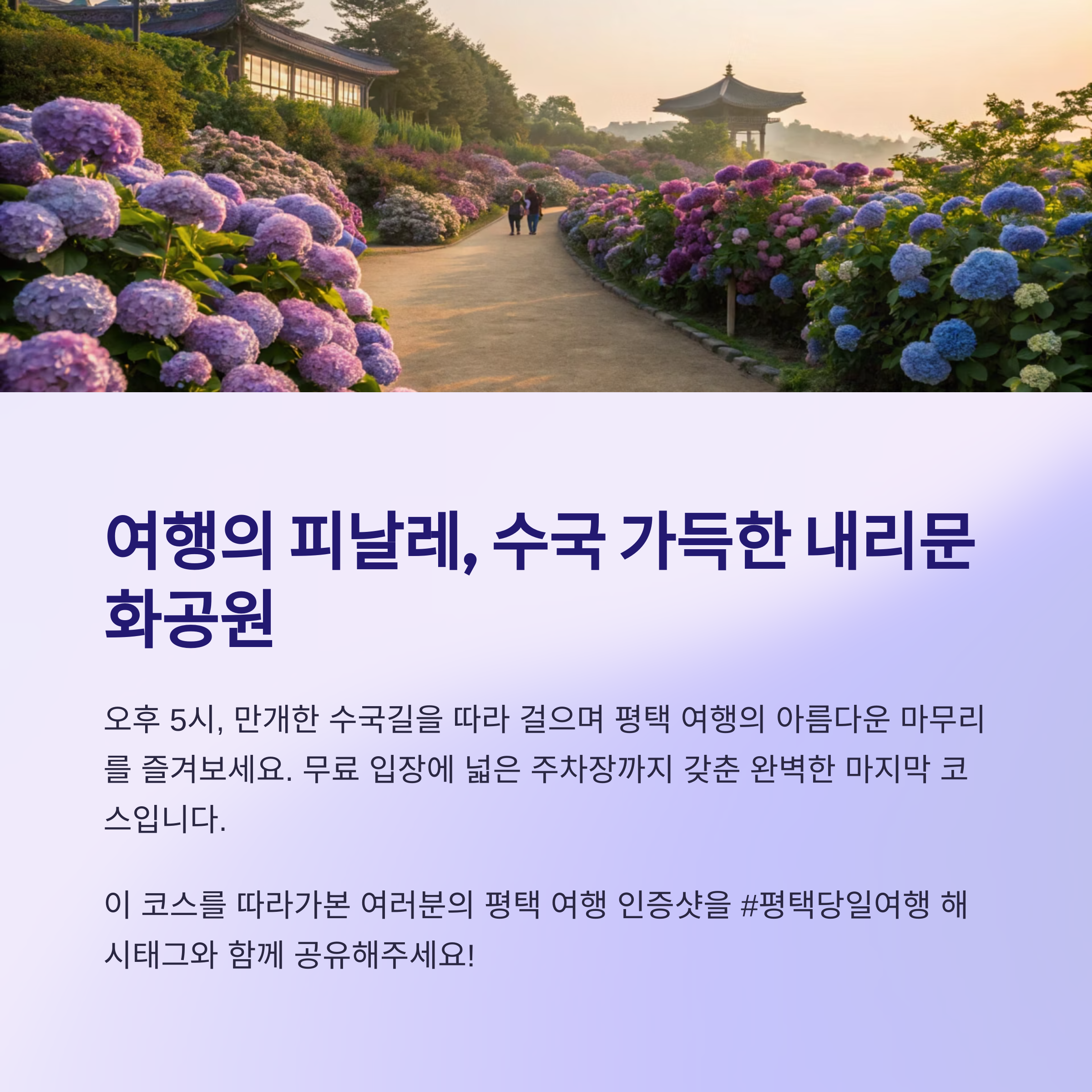 평택은 다양한 자연경관과 문화공간을 동시에 즐길 수 있는 매력이 있습니다.
