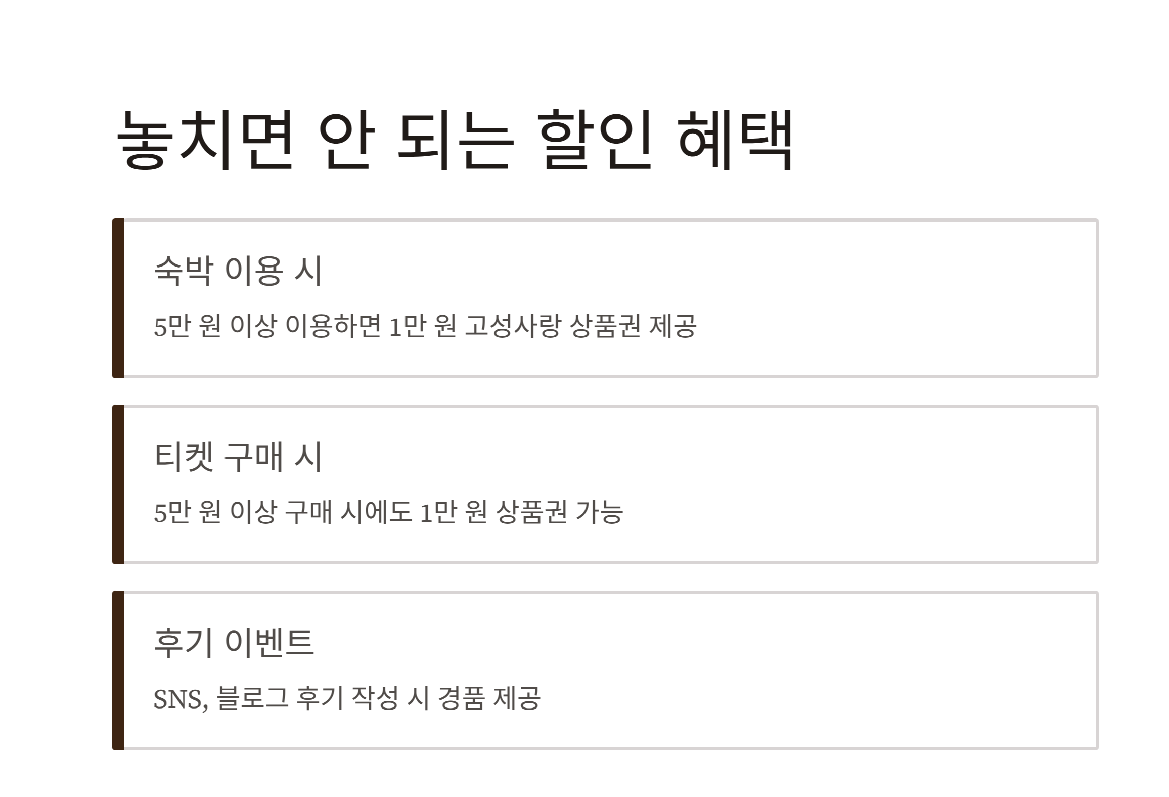 | 고성 지역 숙박 이용 시 | 숙박비 5만 원 이상 이용하면 1만 원 고성사랑 상품권 제공 (한시적인 이벤트인 것 같긴 했으나, 저희는 티켓 구입금액이 5만원 넘으니 1만원 상품권 그냥 주셨어요.) |