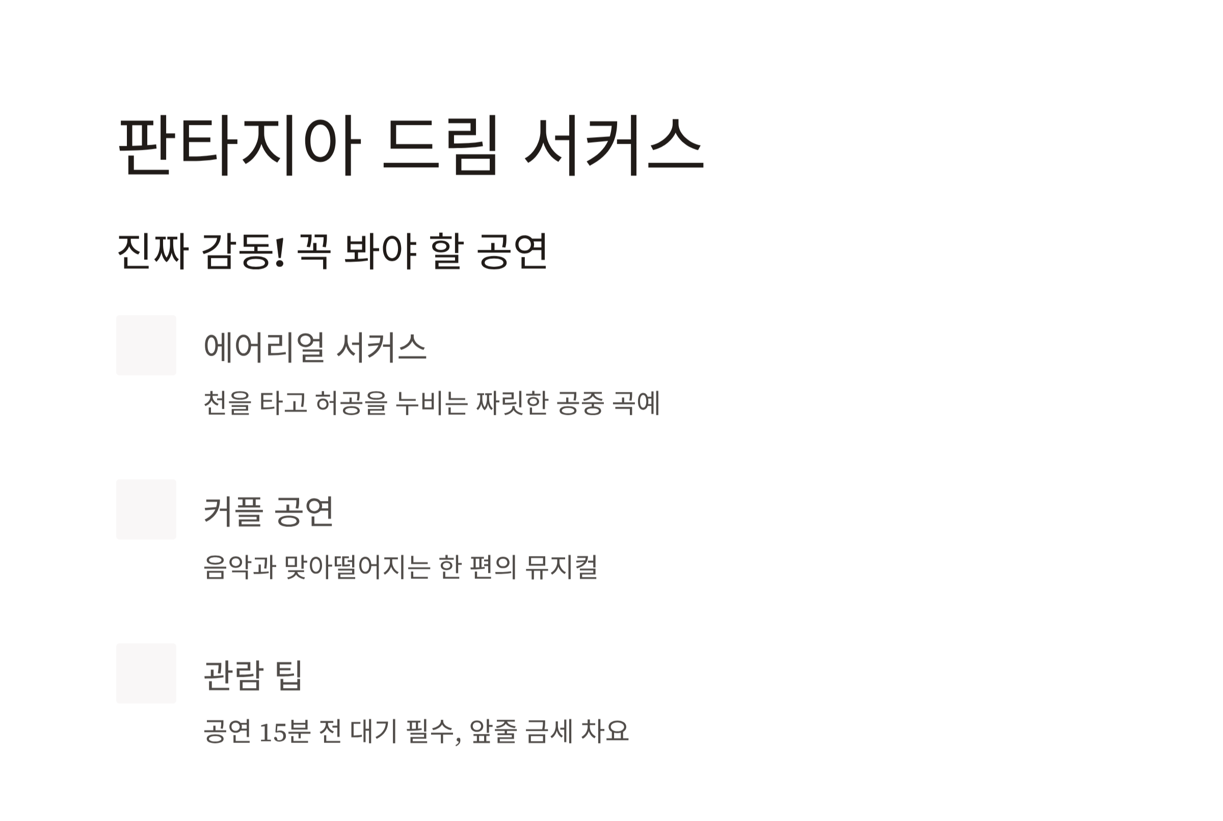 | 12시 | 서커스 공연 감상 (에어리얼 중심) |