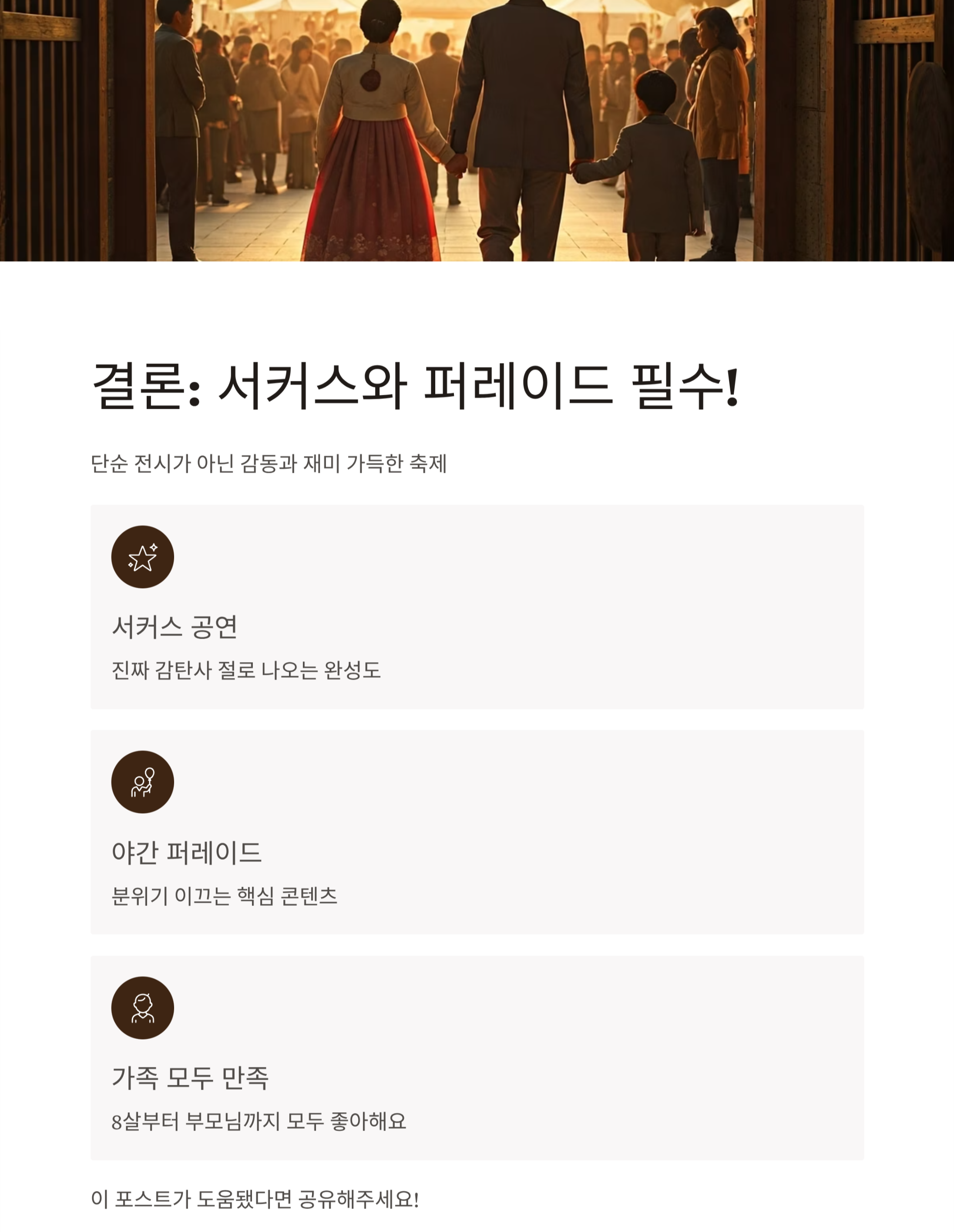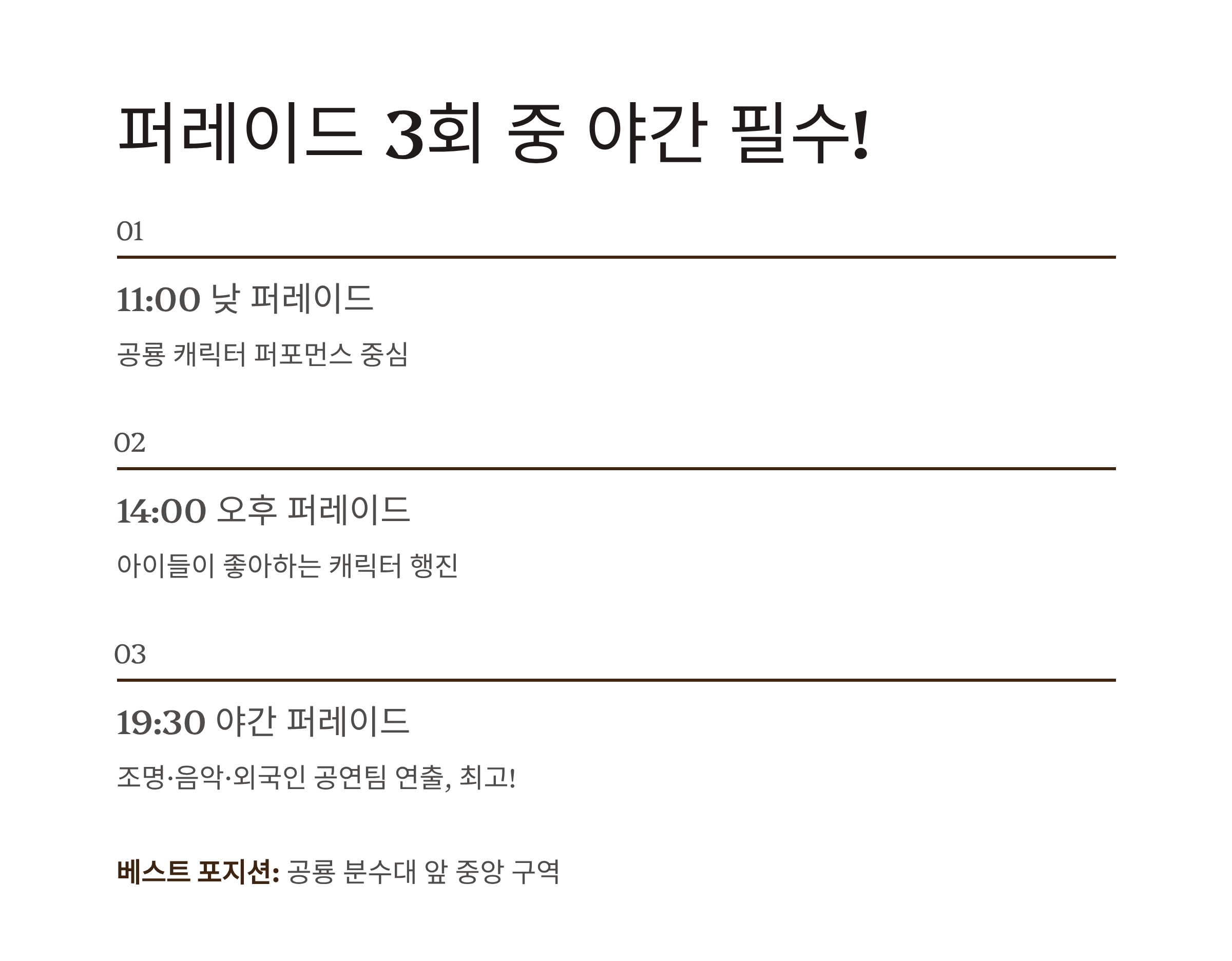 정리하자면, 예매는 끝났지만 혜택은 아직 남아 있고, 서커스와 퍼레이드는 반드시 관람해야 하는 필수 코스라는 점, 꼭 기억해 두세요.