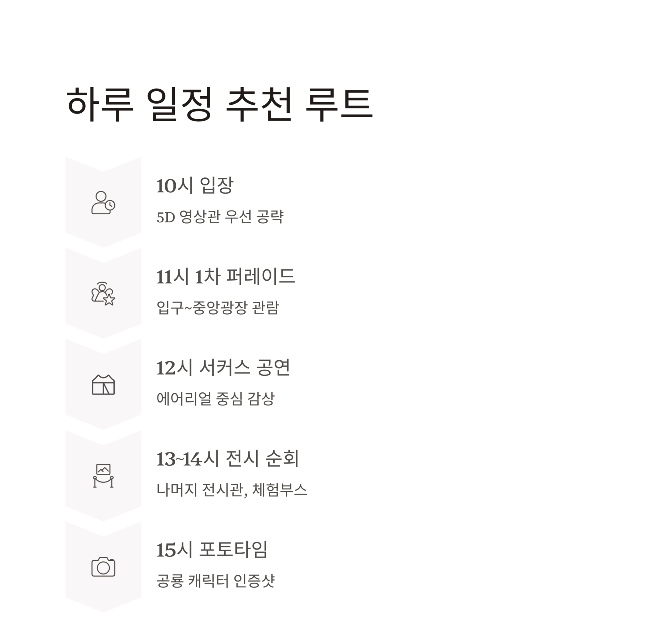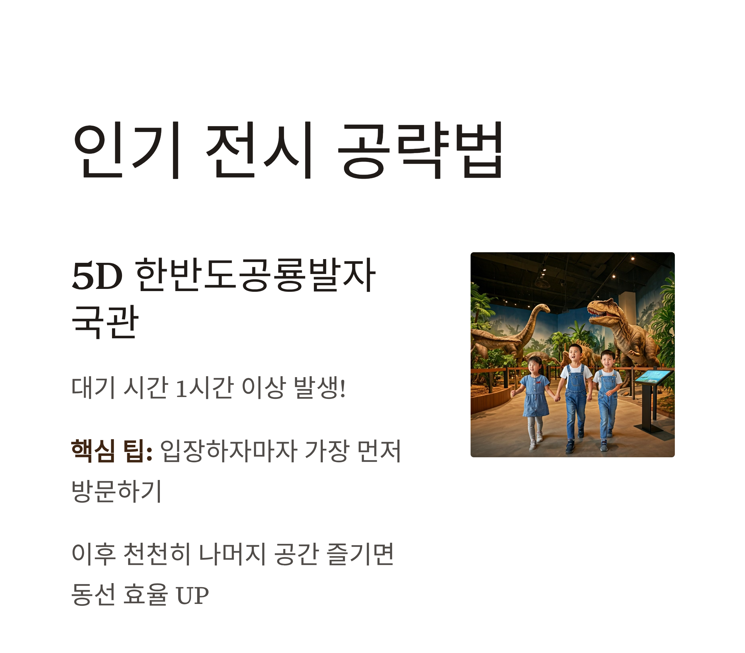 | 오전 10시 입장 | 5D 영상관 등 인기 전시관 우선 공략 |