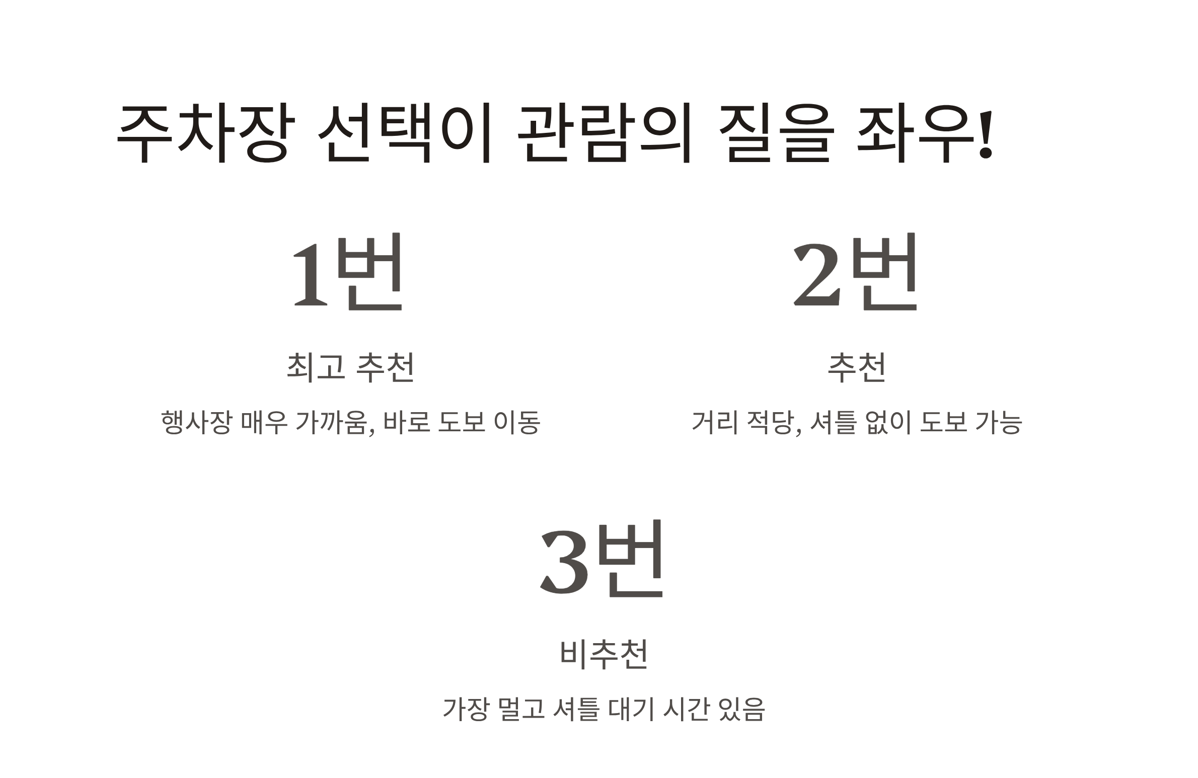 3번 주차장은 거리가 멀고 셔틀버스 대기 시간이 있다는 의견이 많았어요. 가능하면 1번이나 2번 주차장을 사전에 구글 지도 등으로 위치 확인하고, 일찍 도착해서 가까운 주차장에 정차하는 것이 관람 효율을 높이는 핵심 전략입니다.