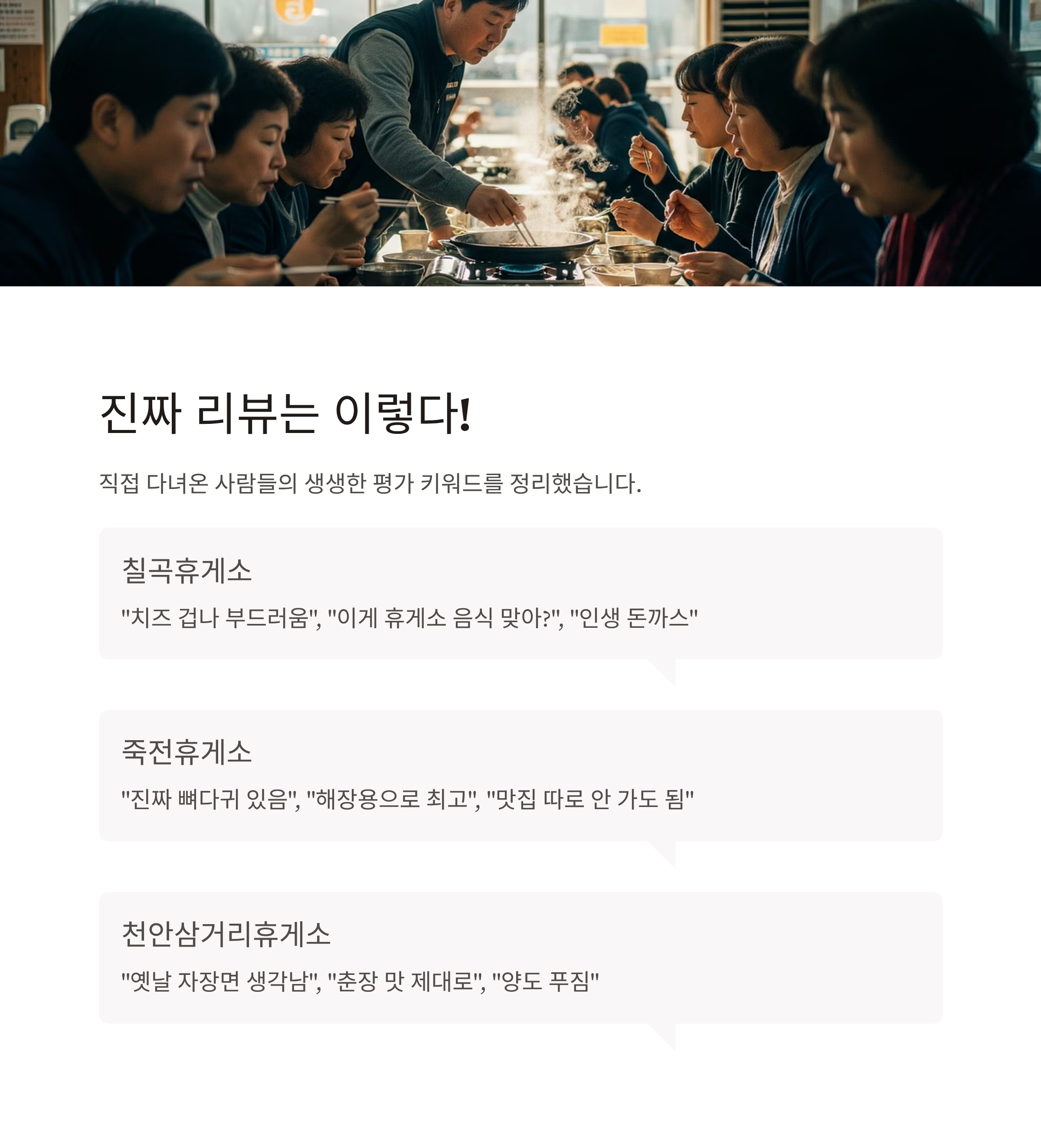 | 죽전휴게소 | “진짜 뼈다귀 있음”, “해장용으로 최고”, “맛집 따로 안 가도 됨” |