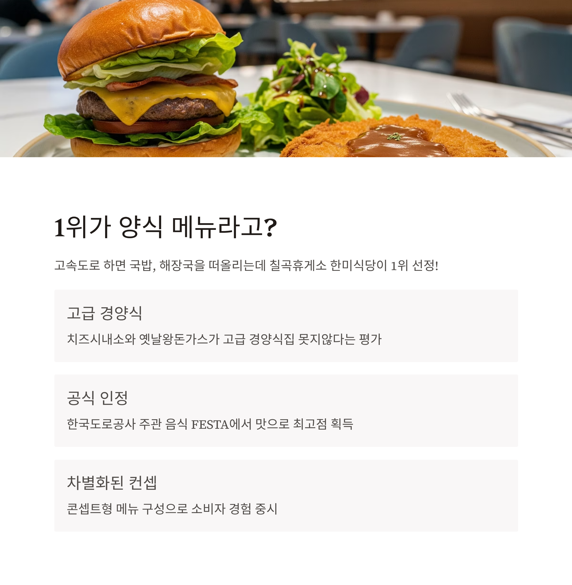 | 1위 | 칠곡휴게소 (부산 방향) | 치즈시내소, 옛날왕돈가스, 한미버거 | “명품 맛집” 대상 수상. 전통 메뉴 아닌 경양식 메뉴로 이례적 수상 |