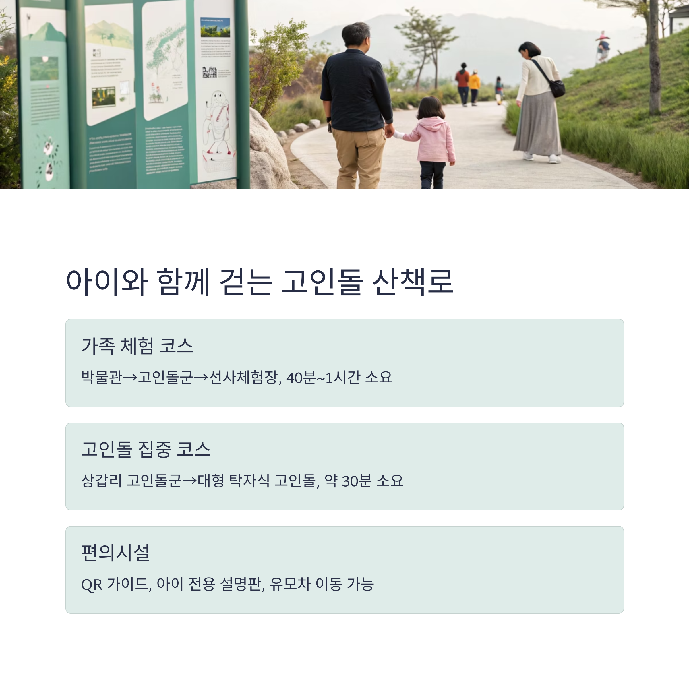 | 가족 체험 코스 | 고인돌박물관 → 고인돌군 산책로 → 선사체험장 | 40분~1시간 | 매우 쉬움 |