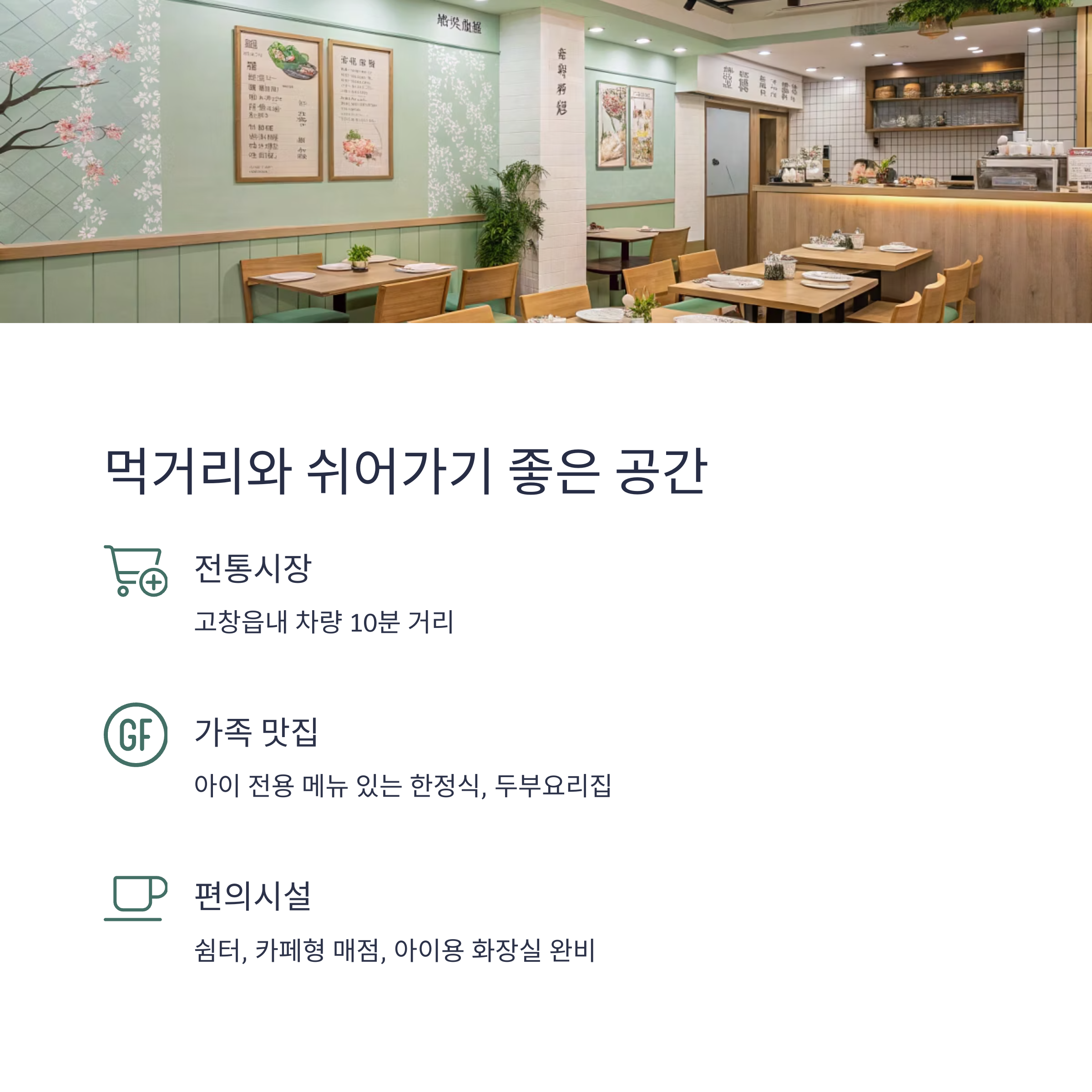 - 근처에 아이 전용 메뉴 가능한 한정식, 두부요리집 등 존재