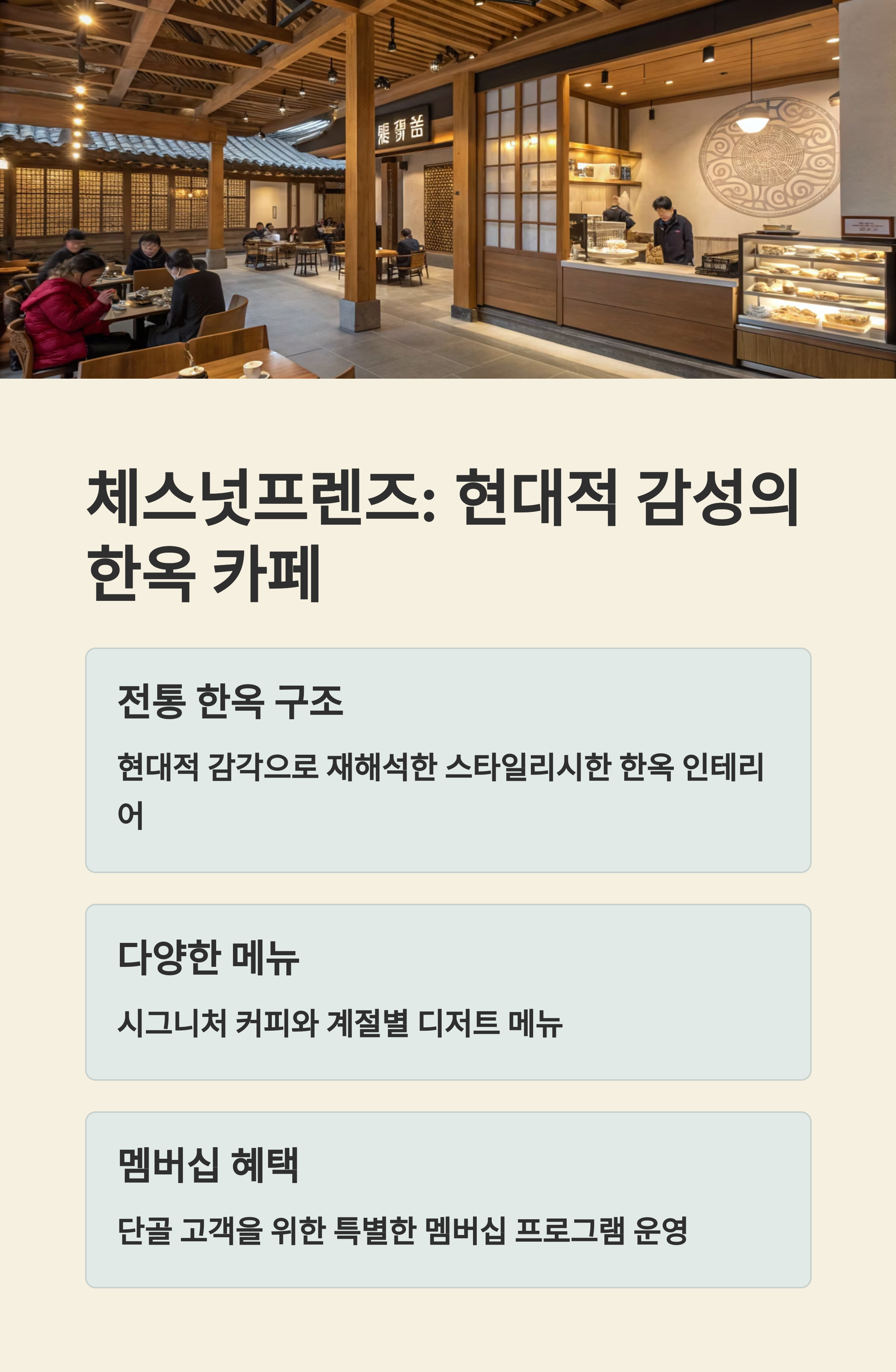 또한 한옥 스타일의 체스넛프렌즈는 전통과 모던함을 조화롭게 꾸며 놓아 이색적인 공간을 경험할 수 있습니다.