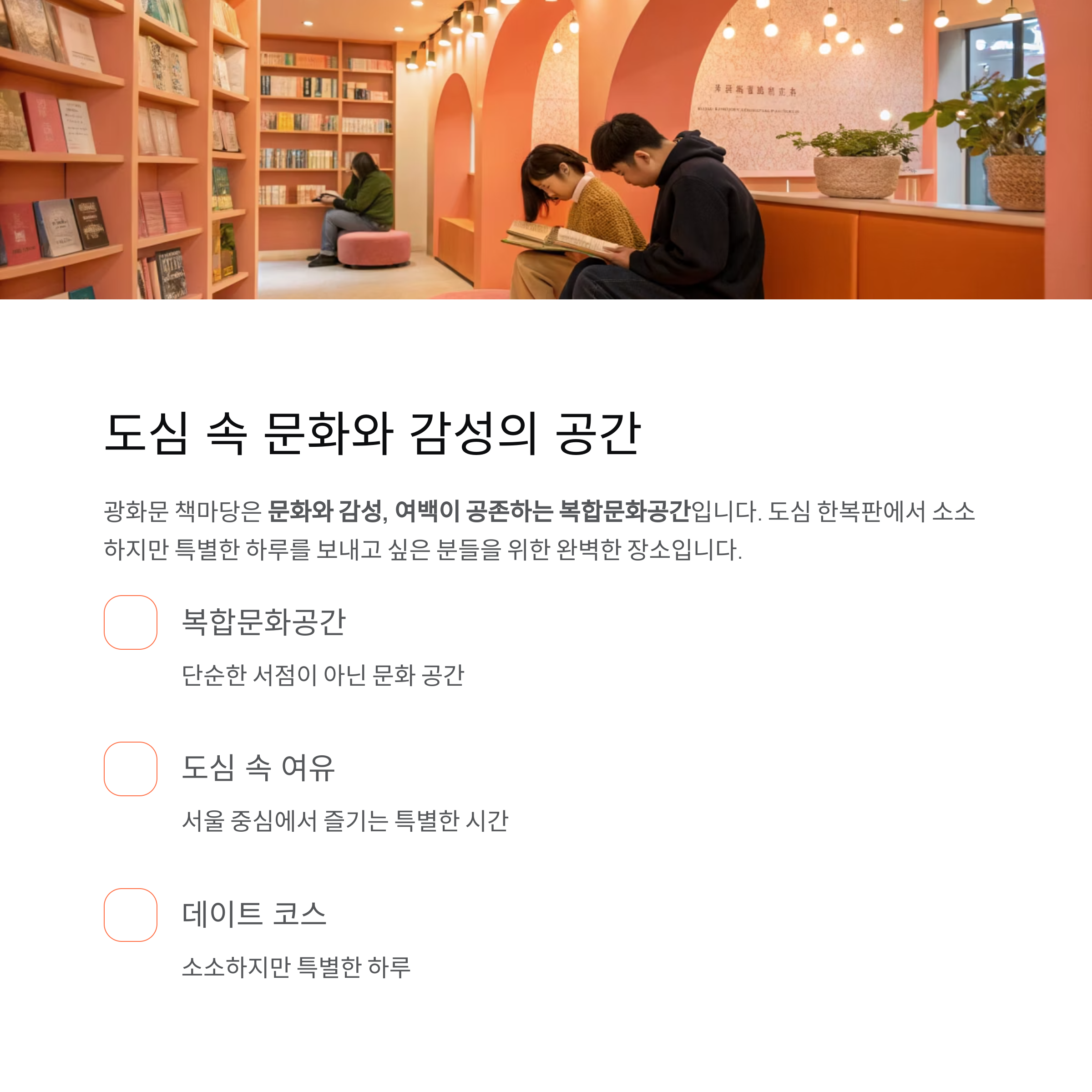 단순한 책 판매 공간을 넘어 ‘머무는 서점’의 개념을 구현한 독서 문화 공간입니다.