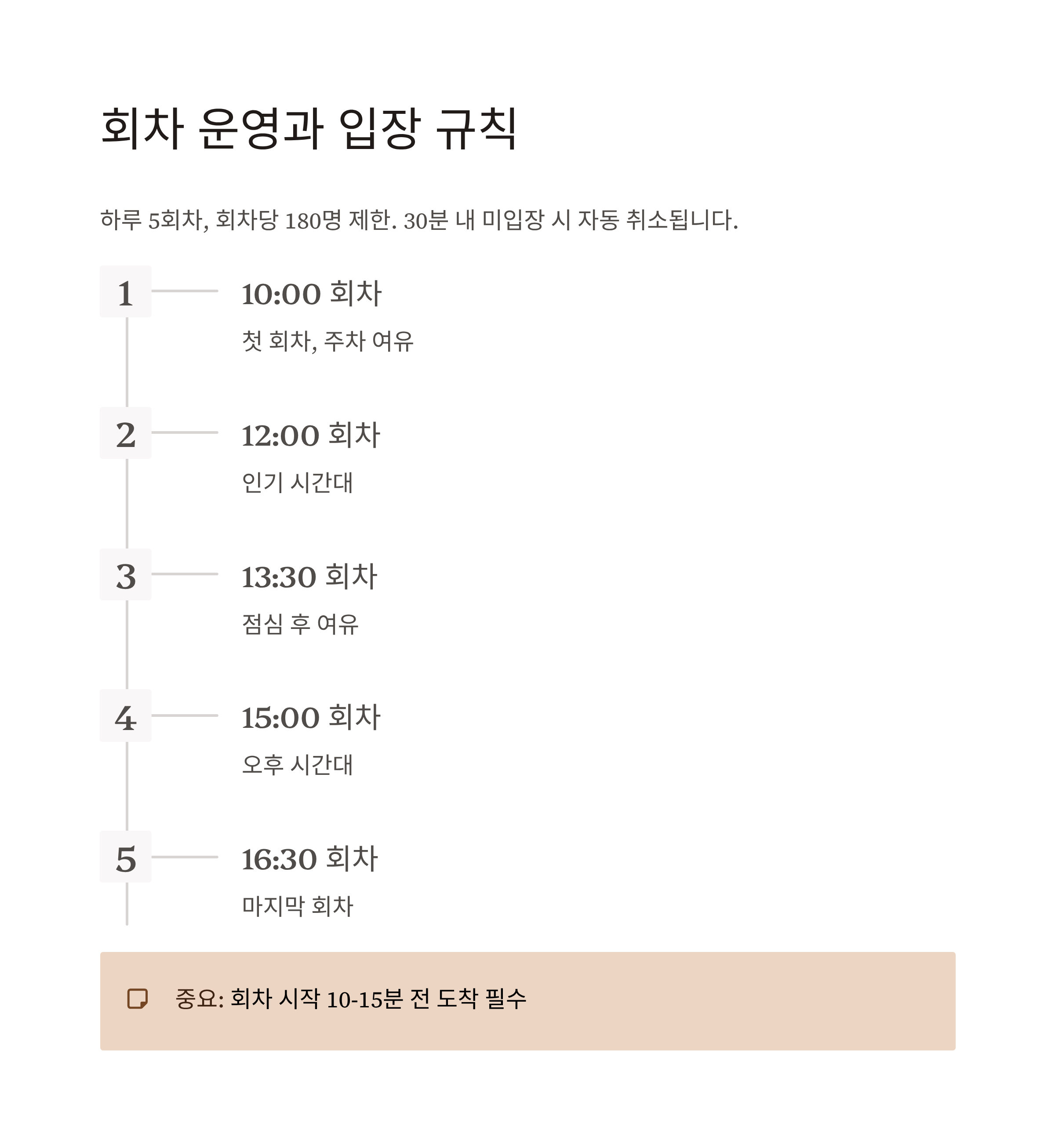 하루 5회차 방식이 일반적입니다. 예시로 10:00, 12:00, 13:30, 15:00, 16:30가 자주 보이고, 회차당 인원 제한(약 180명 수준)과 예약당 최대 5명 제한이 있어요. 회차 시작 30분 이내 미입장 시 자동 취소 처리되니, 최소 10~15분 전 도착이 안전합니다. 인원 감축은 온라인에서 비교적 수월하지만 추가 증원은 거의 불가하다는 후기가 많습니다.