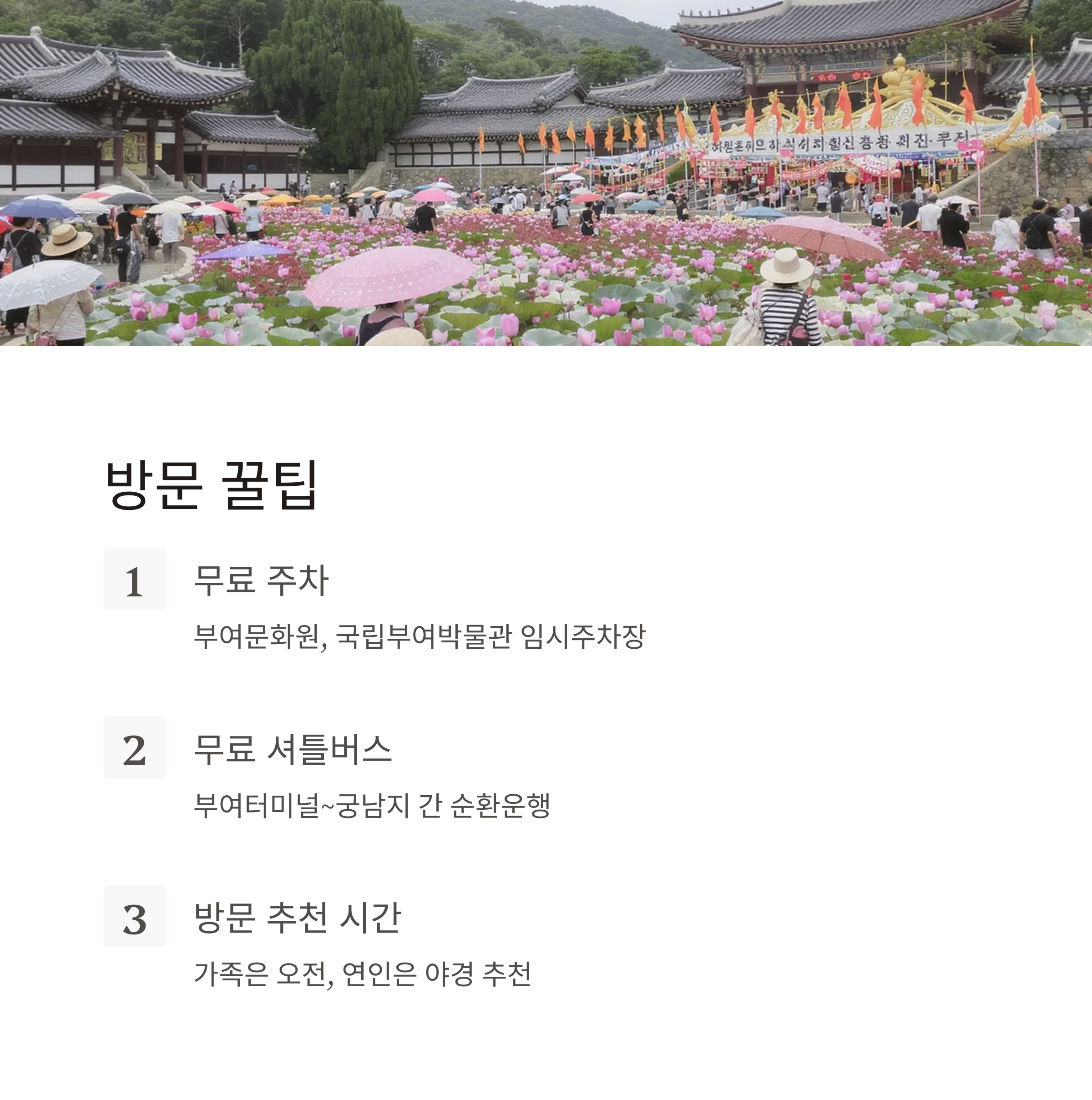 - 셔틀버스 운영: 축제기간 중 부여터미널~궁남지 간 무료 순환버스