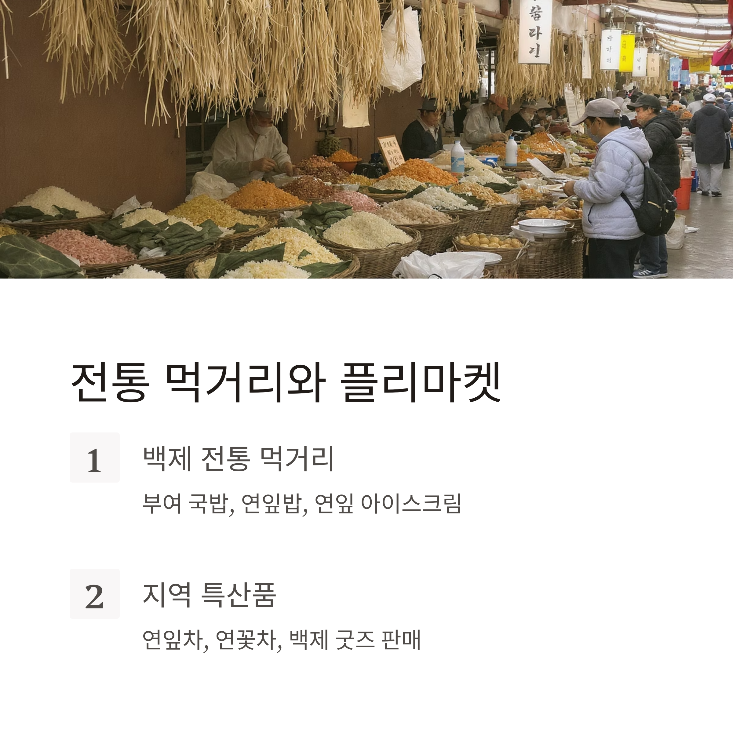 - 지역 농산물 플리마켓: 연잎차, 연꽃차, 백제 굿즈 등 판매
