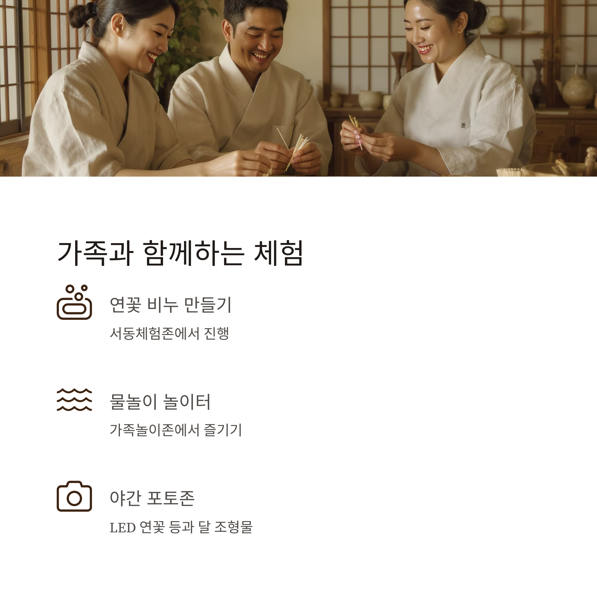| 서동체험존 | 연꽃 비누 만들기, 서동 머리띠 만들기, 전통 연 만들기 |