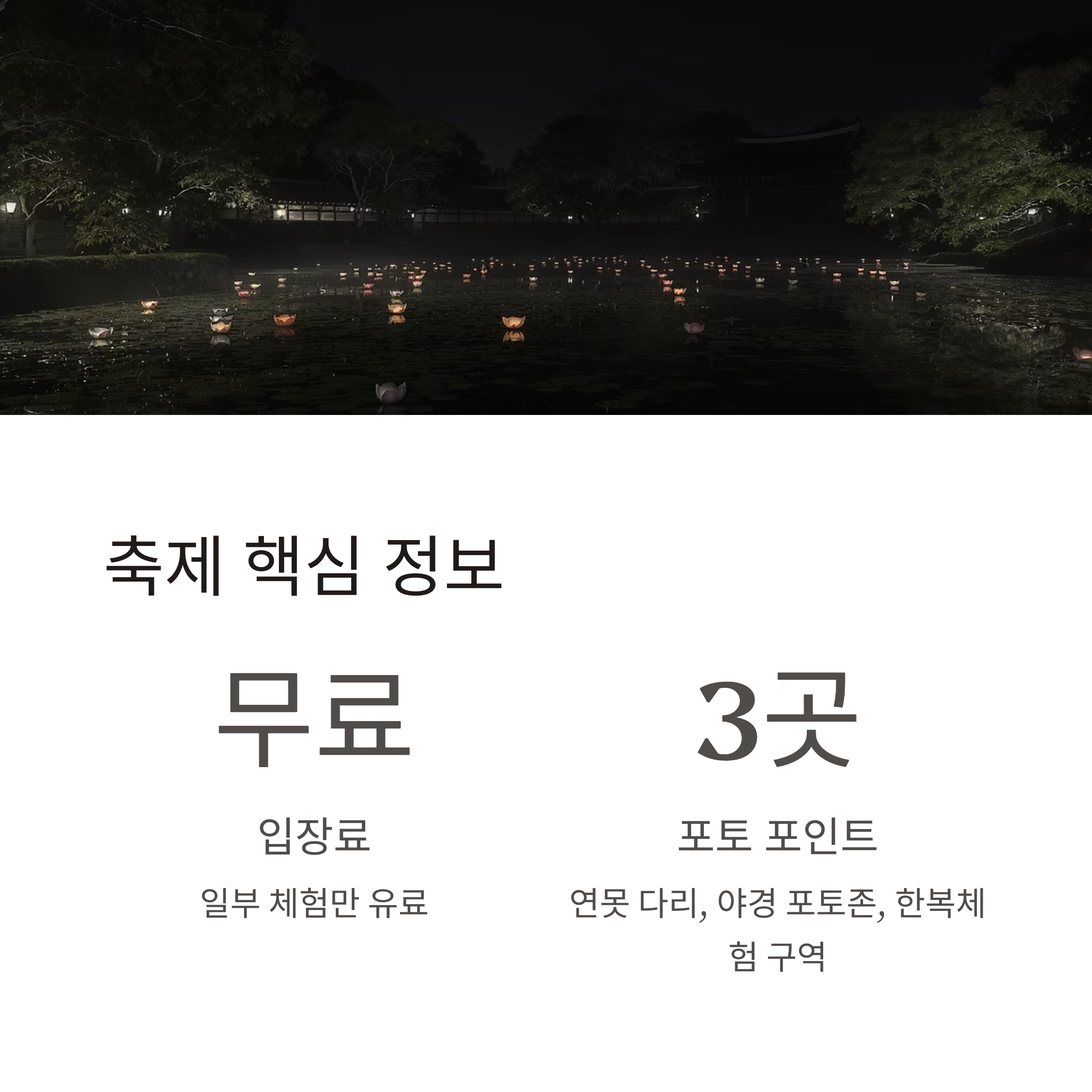 | 포토 포인트 | 연못 다리 / 야경 포토존 / 한복체험 구역 |
