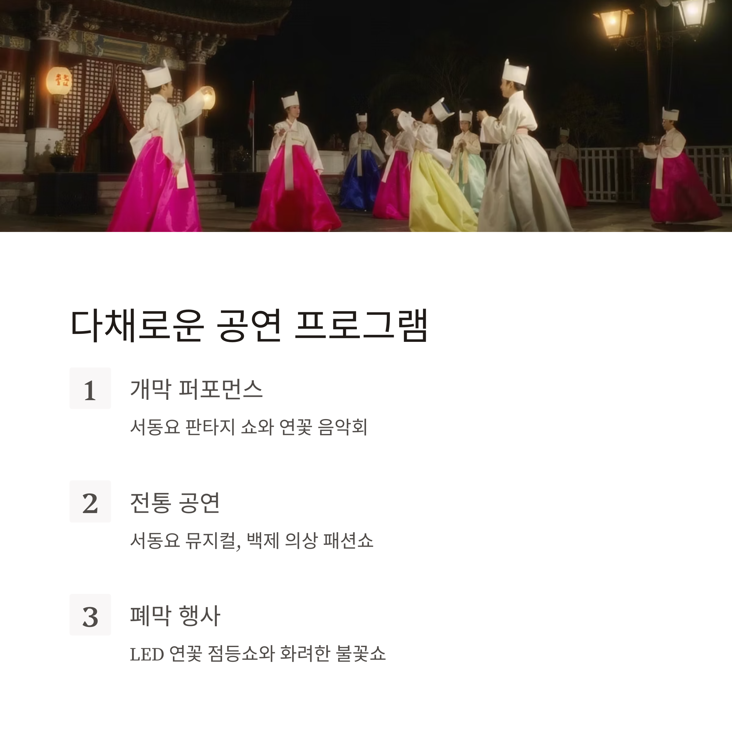 | 야간 포토존 | LED 연꽃 등, 달 조형물, 백제 의상 체험 포토 |