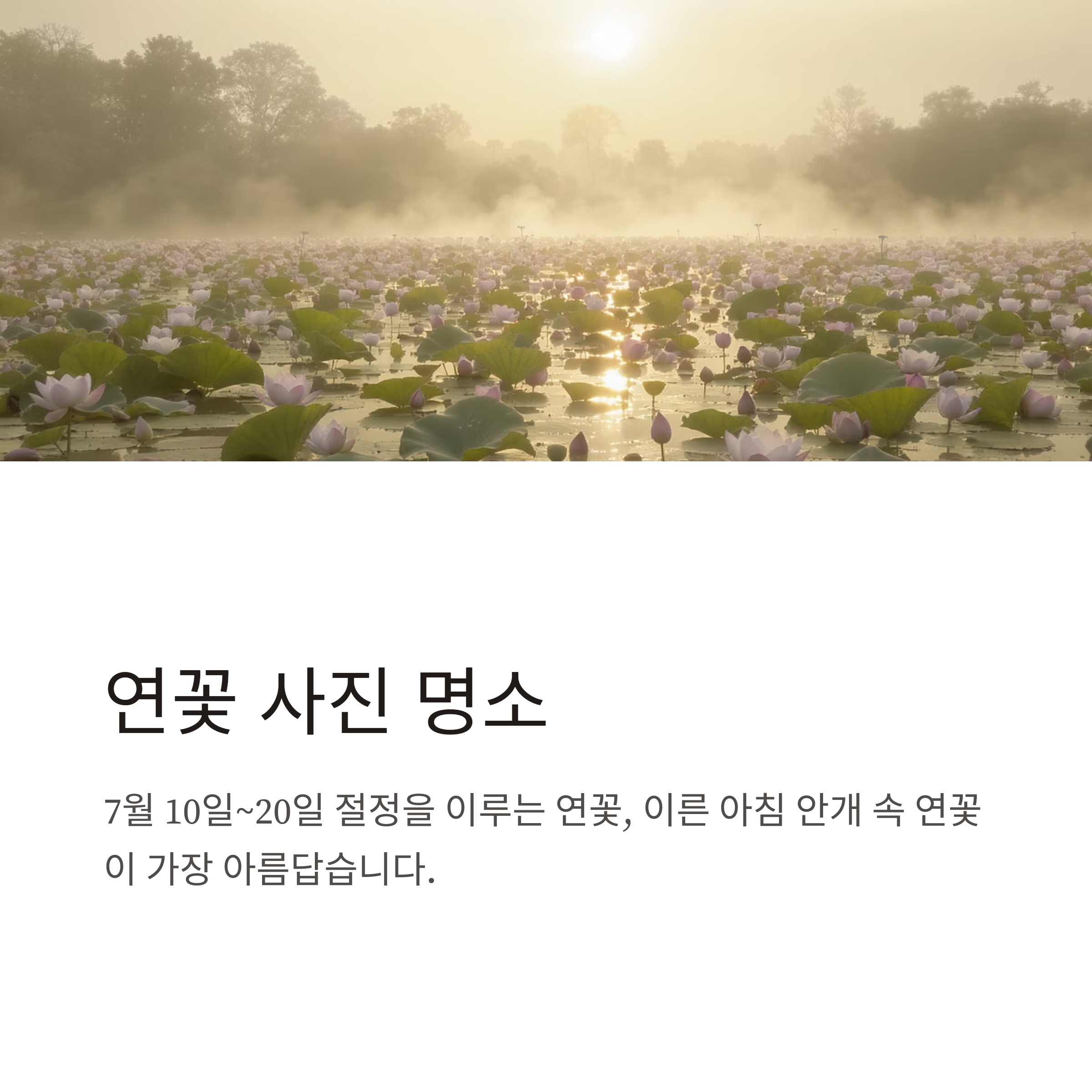 - 이른 아침 (07:00~09:00) 방문 시 빛·안개·연꽃 조합 최고