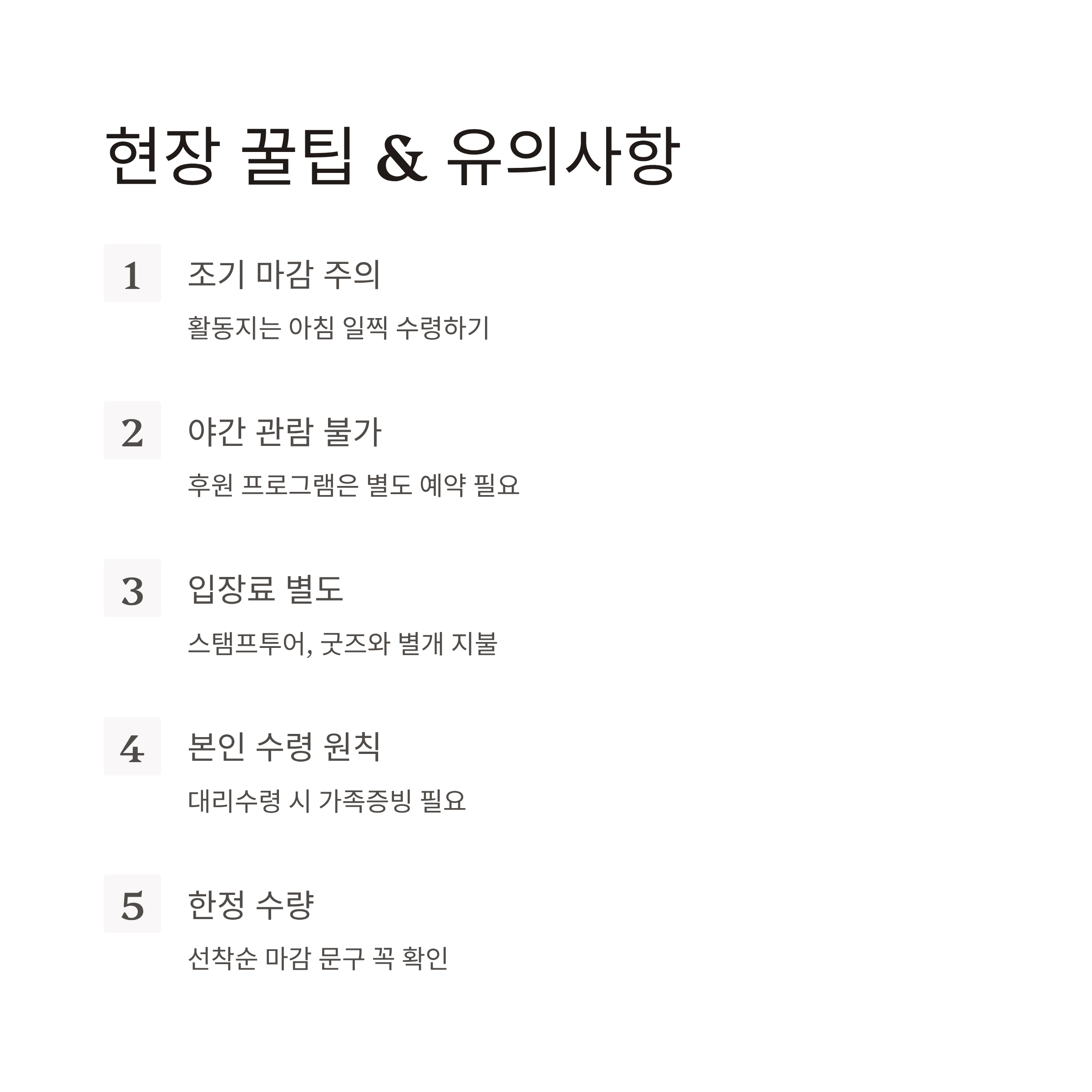 - 예매자 본인 수령 원칙 → 대리수령 시 가족증빙 필요할 수 있음