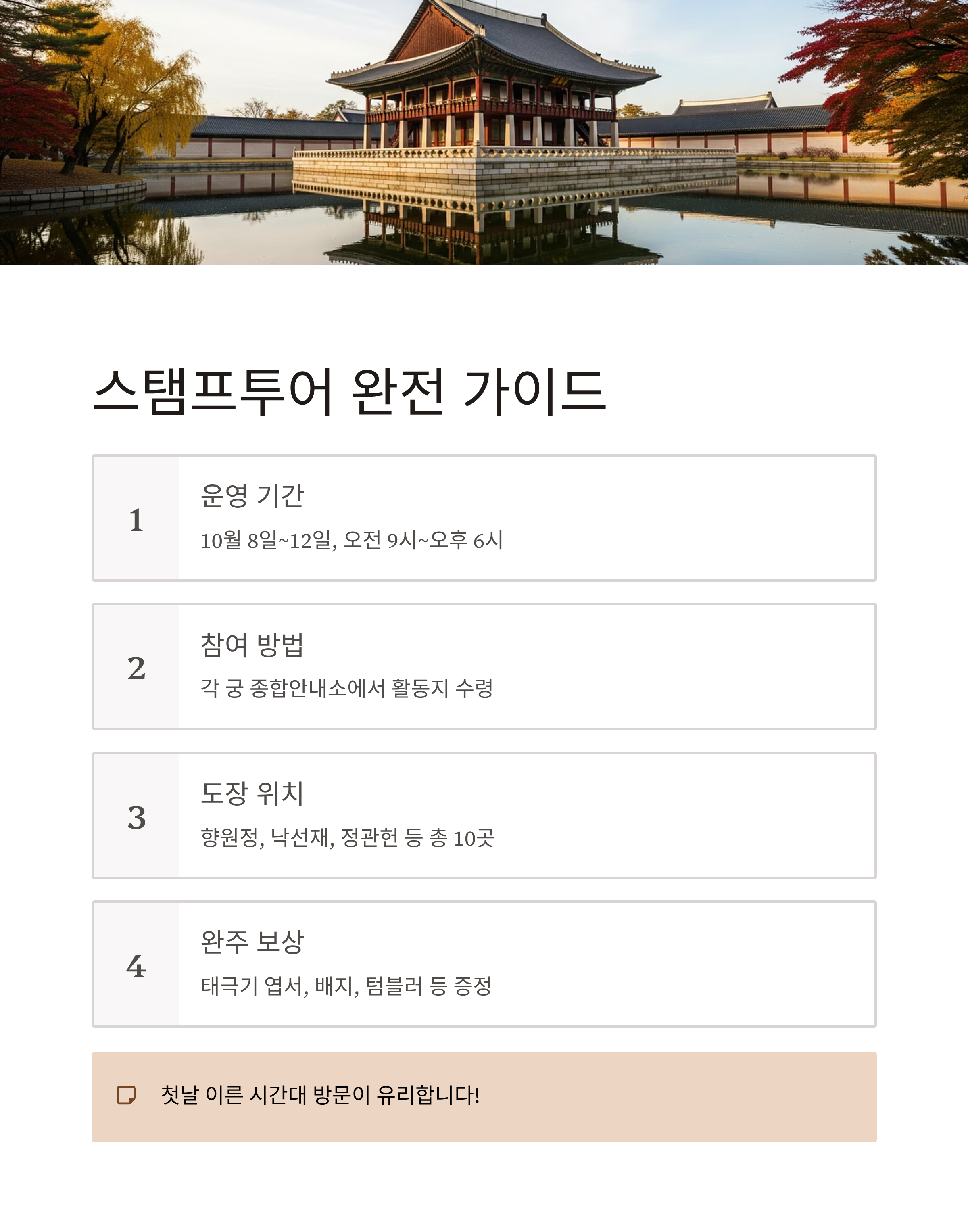 | 유의사항 | 입장료는 별도, 중복 수령 불가, 도장 조작 시 보상 제한 가능 |