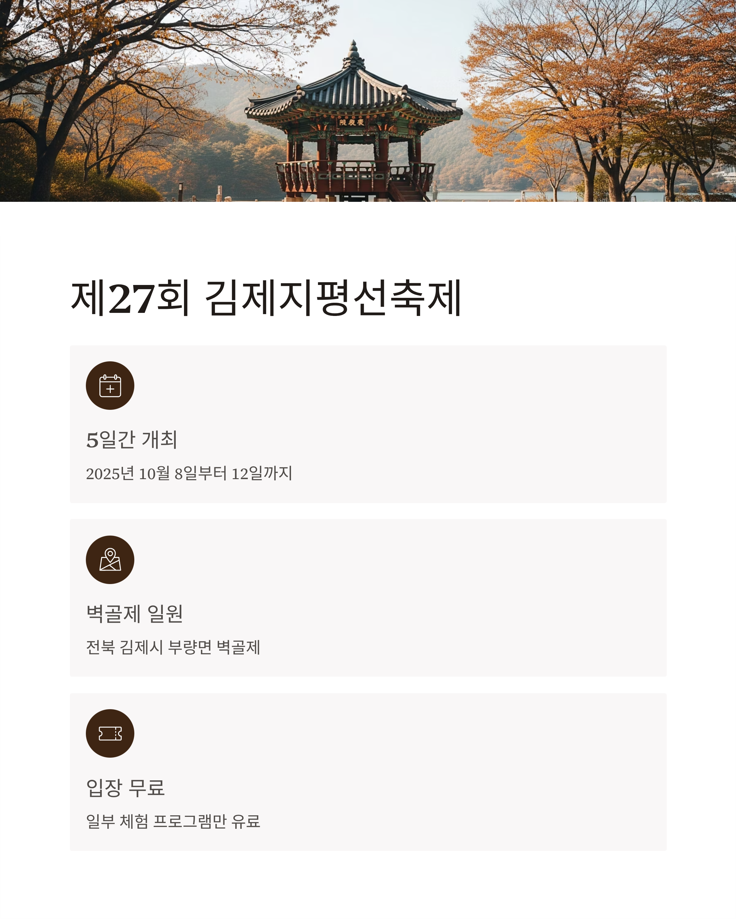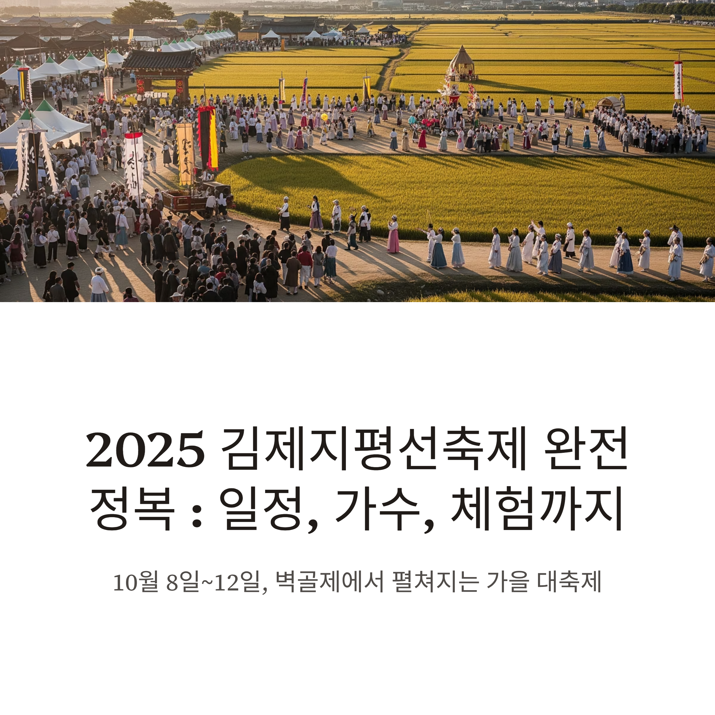 전라북도 김제의 대표 축제, 김제지평선축제가 올해로 27회를 맞이합니다. 2025년 10월 8일부터 12일까지 5일간 열리는 이번 축제는 다양한 전통 체험과 공연, 그리고 쉴 틈 없는 볼거리로 가득한데요. 셔틀버스부터 초대가수 라인업까지, 축제 가기 전에 꼭 알아야 할 핵심 정보를 모두 정리해 드릴게요.