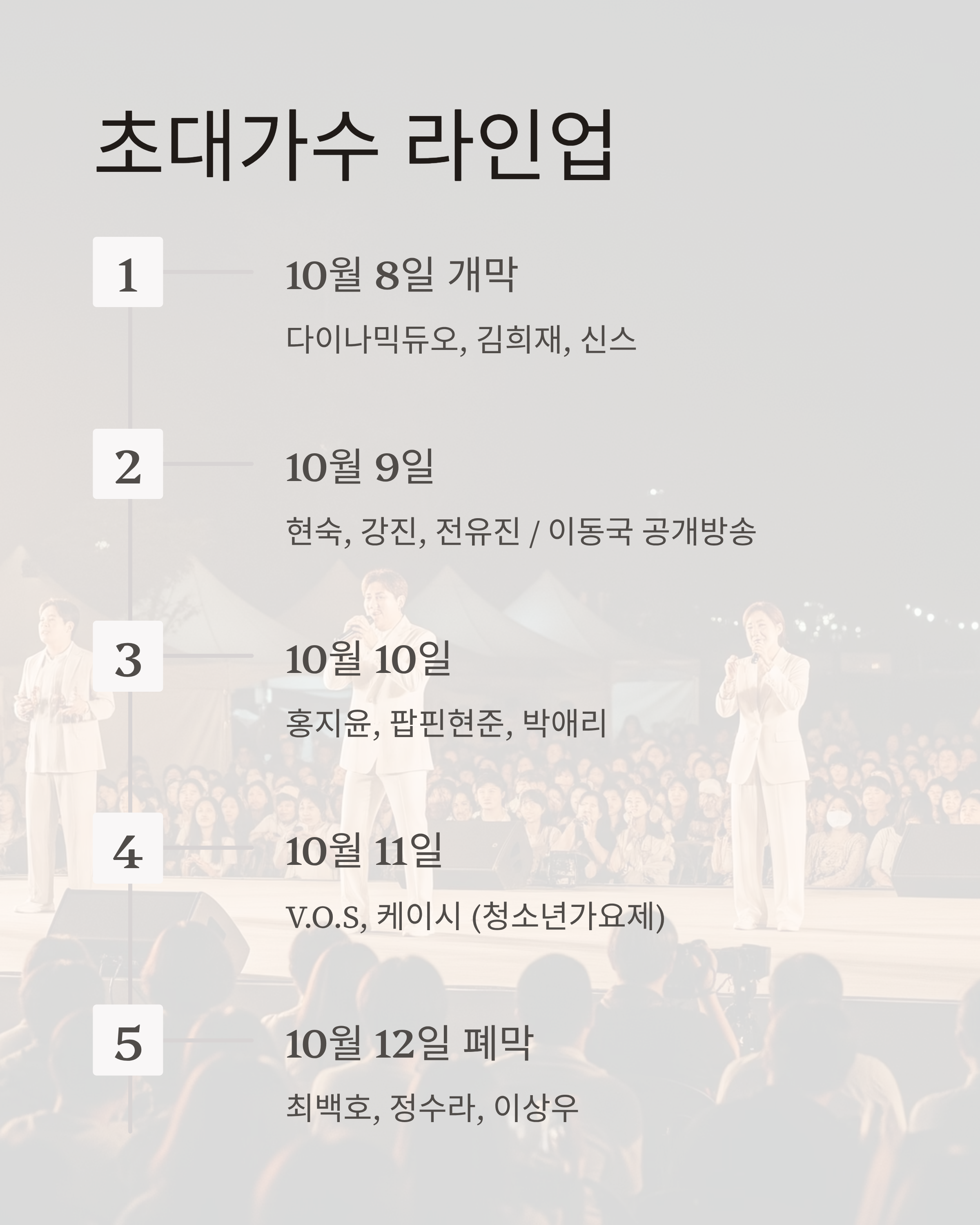 | 10월 8일 (수) | 개막식: 다이나믹듀오, 김희재, 신스 |