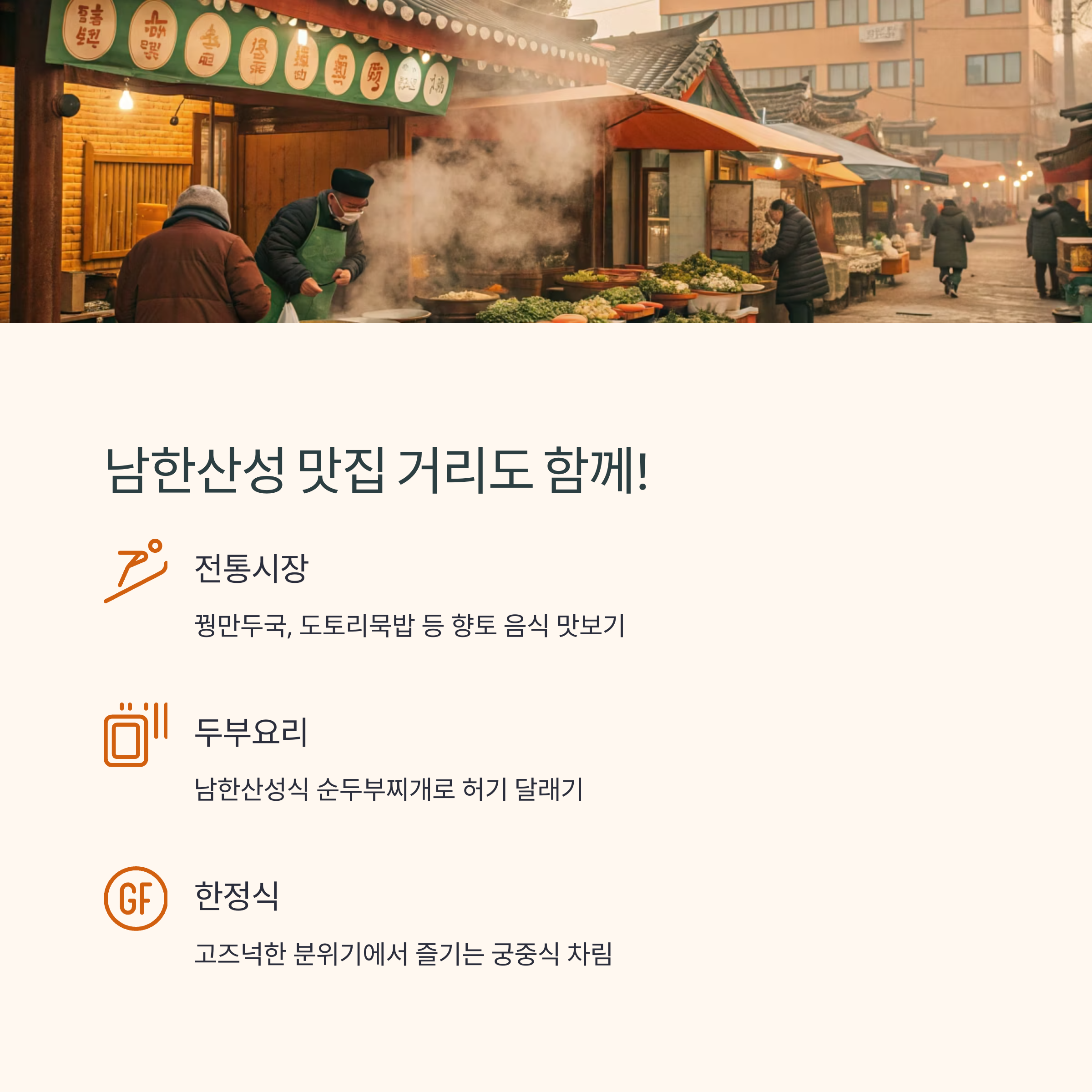 - 남한산성 전통시장: 꿩만두국, 도토리묵밥 등 향토 음식