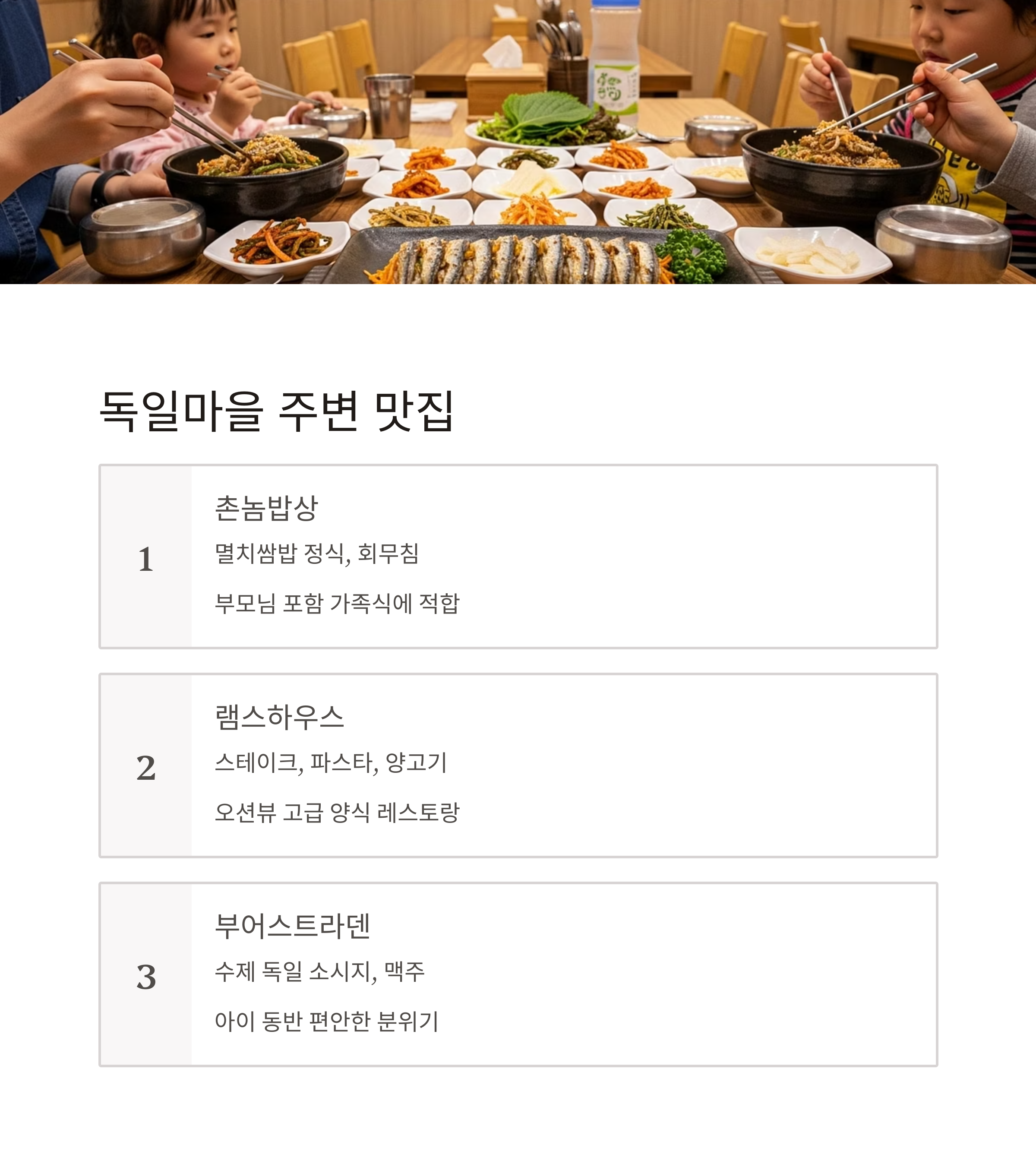 | 주차 | 독일마을 주말 혼잡, 오전 10시 이전 도착 추천 |