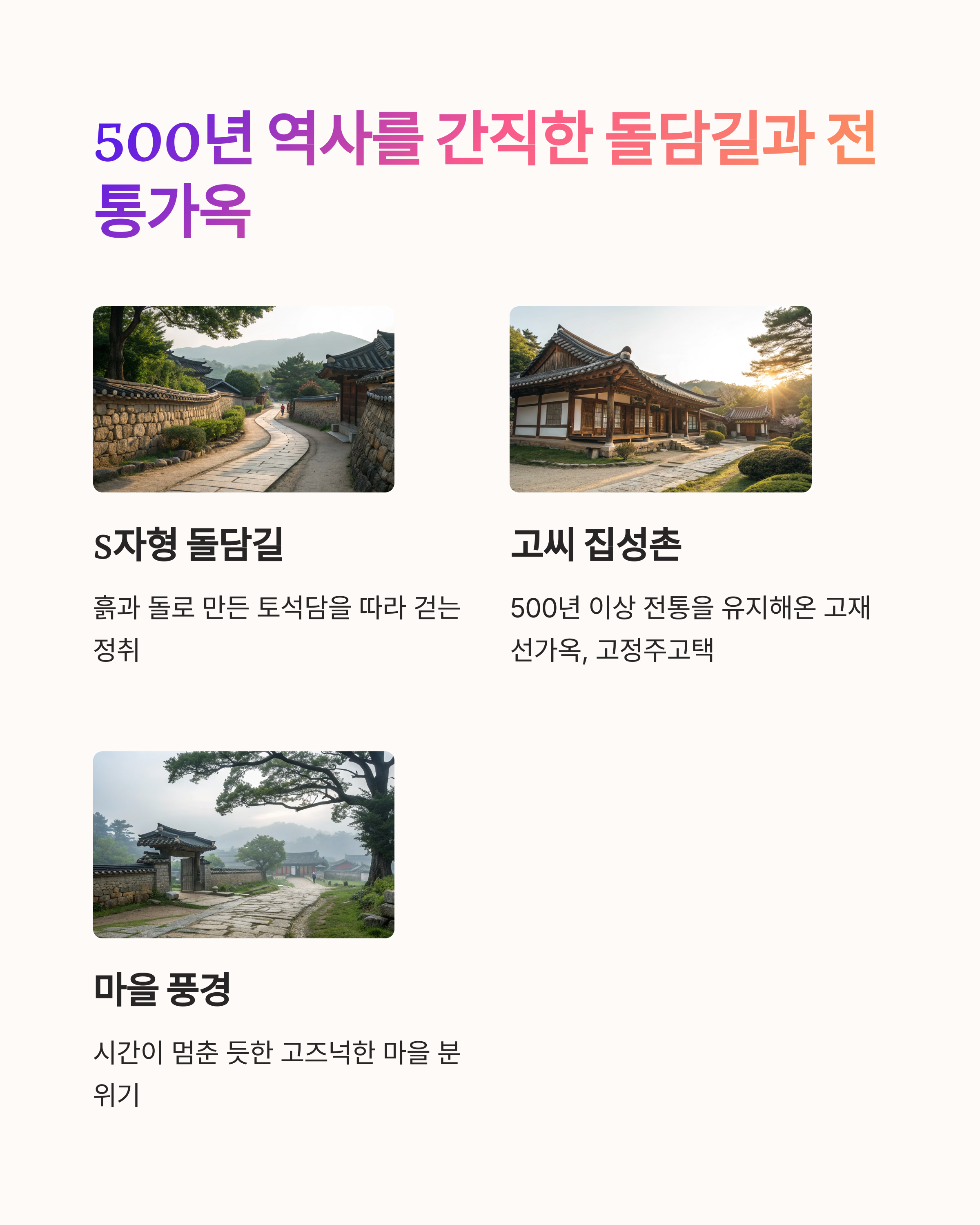이곳은 오랜 전통을 간직한 돌담길과 아름다운 삼지천이 있어 자연과 역사적 매력을 동시에 느낄 수 있습니다.
