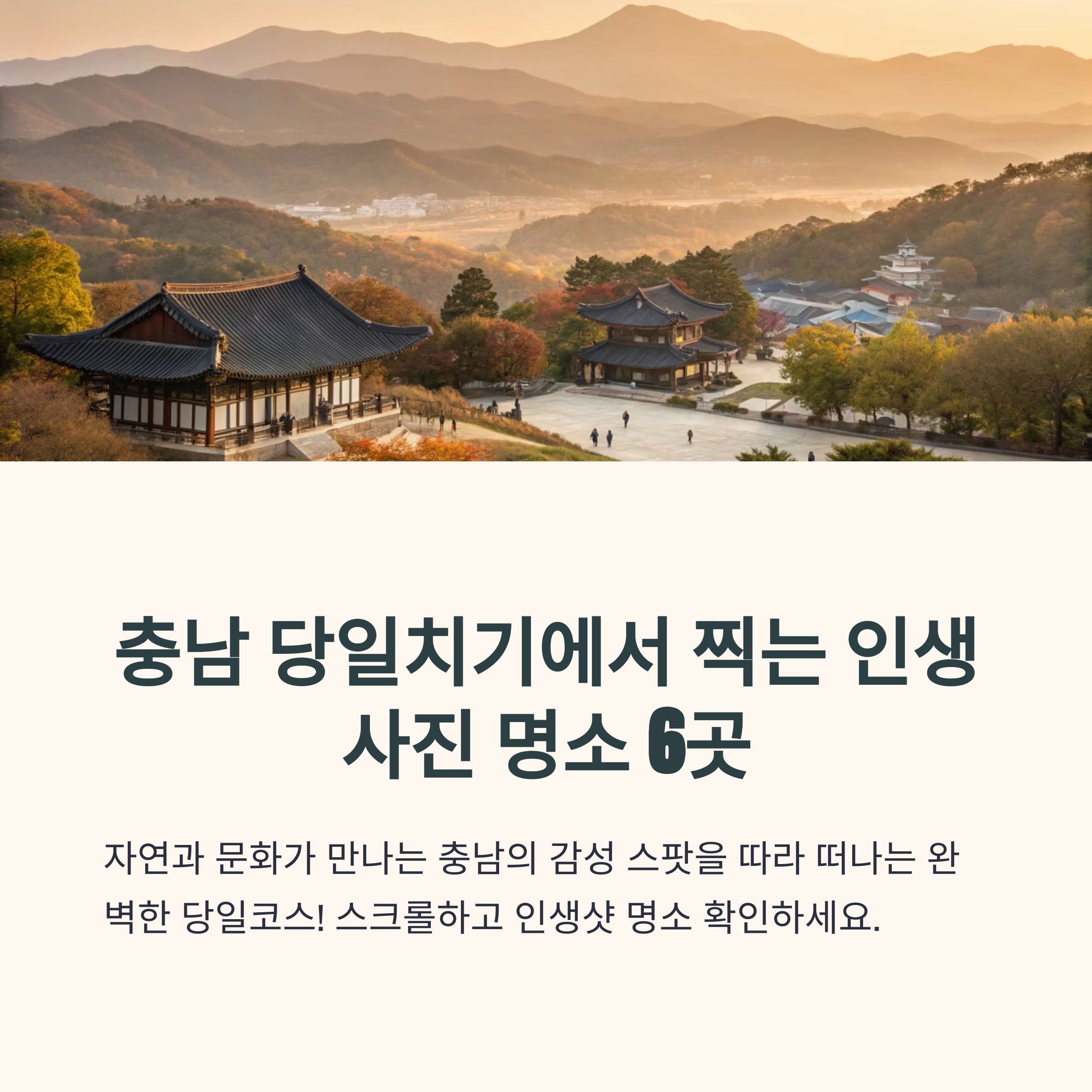 오늘은 충남의 핫플레이스들을 소개하며, 사진 찍기 좋은 스팟들을 중심으로 하는 당일치기 여행 코스를 준비했어요!