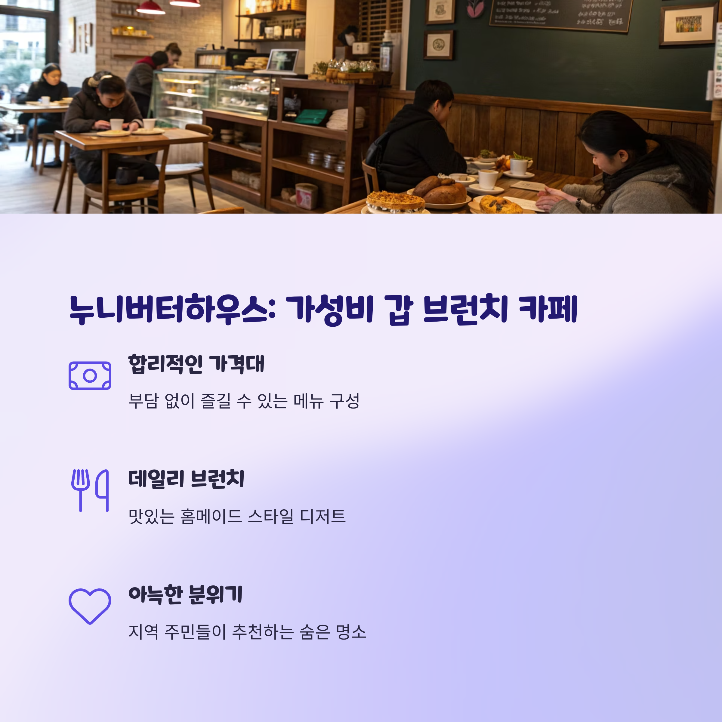 | 누니버터하우스 | 아늑한 친환경 인테리어 | 합리적 가격과 메뉴 | 10:00 - 22:00 |