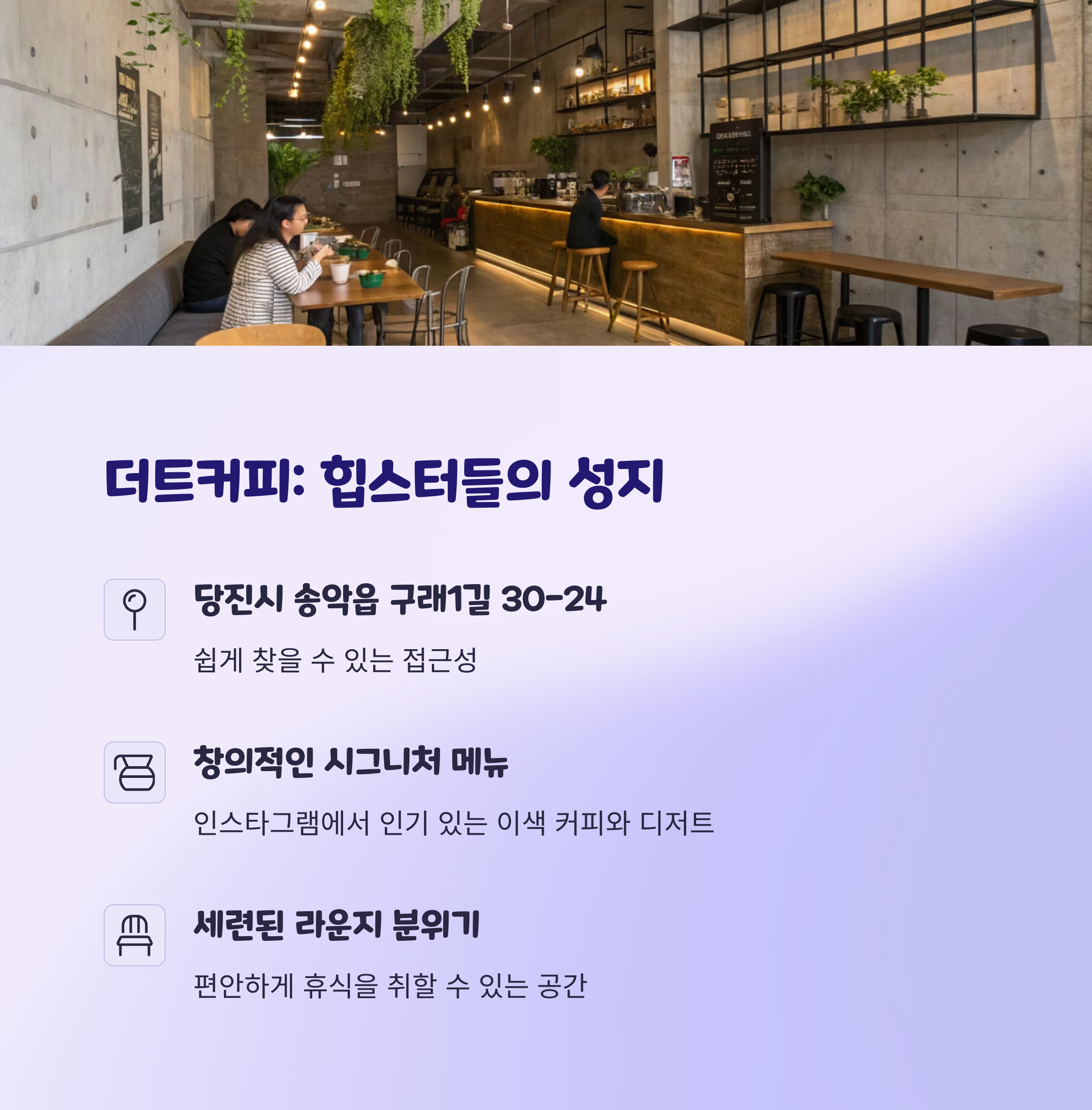 | 힙한 분위기의 카페로는 ""더트커피""를 추천합니다. 이곳은 트렌디한 인테리어와 창의적인 음료 메뉴로 주목받고 있습니다. 직접 만든 특별한 디저트가 함께 제공되어 더욱 특별한 경험을 제공합니다. 비교적 작은 규모의 공간이지만 아늑하고 조용한 분위기를 즐길 수 있습니다. 당진 송악읍 구래1길에 위치해 있으며, 친구들과의 만남이나 혼자 힐링하기에 적합합니다. |