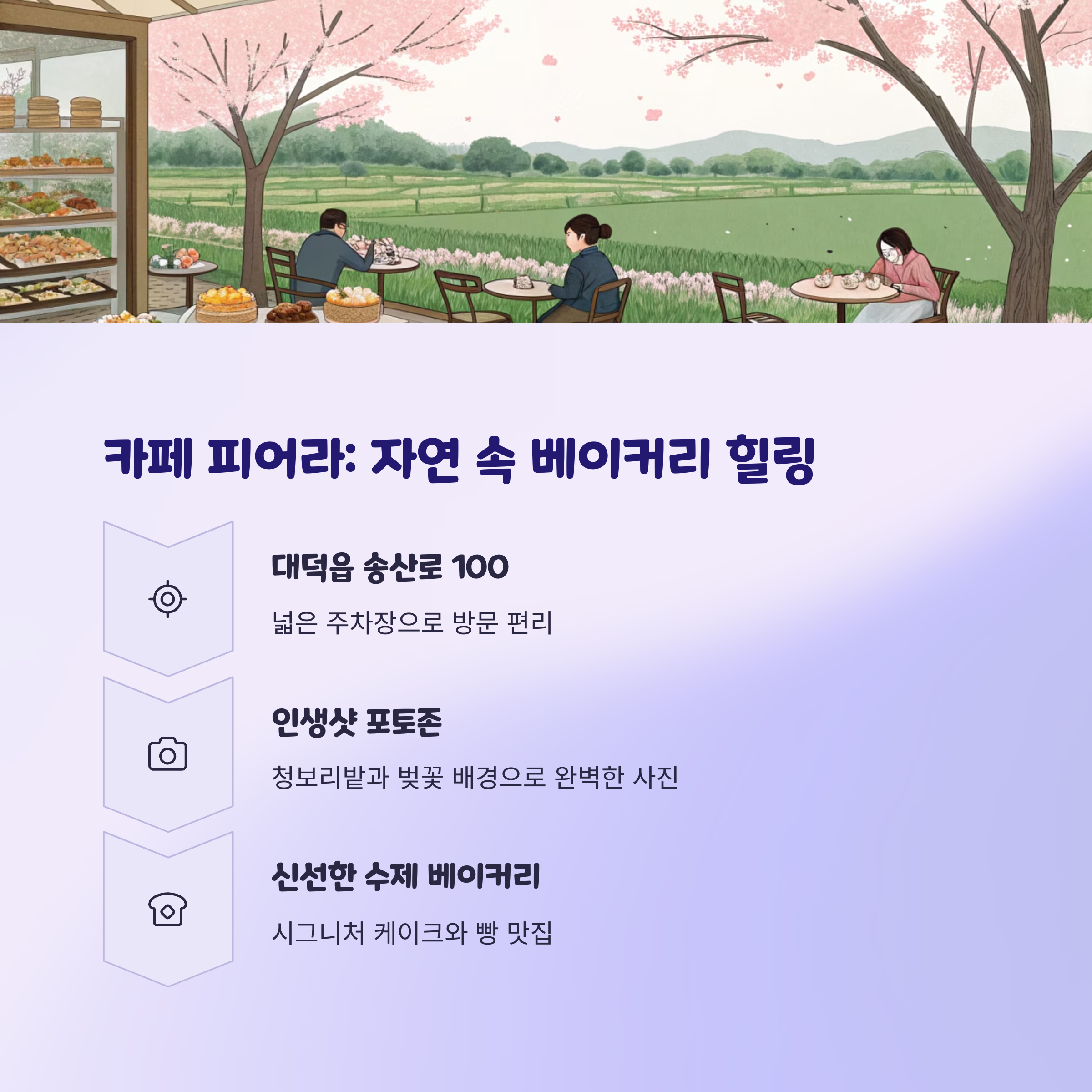 | 카페 피어라 | 농원 속 수제 베이커리 | 자연과 어우러진 힐링 | 09:00 - 20:00 |