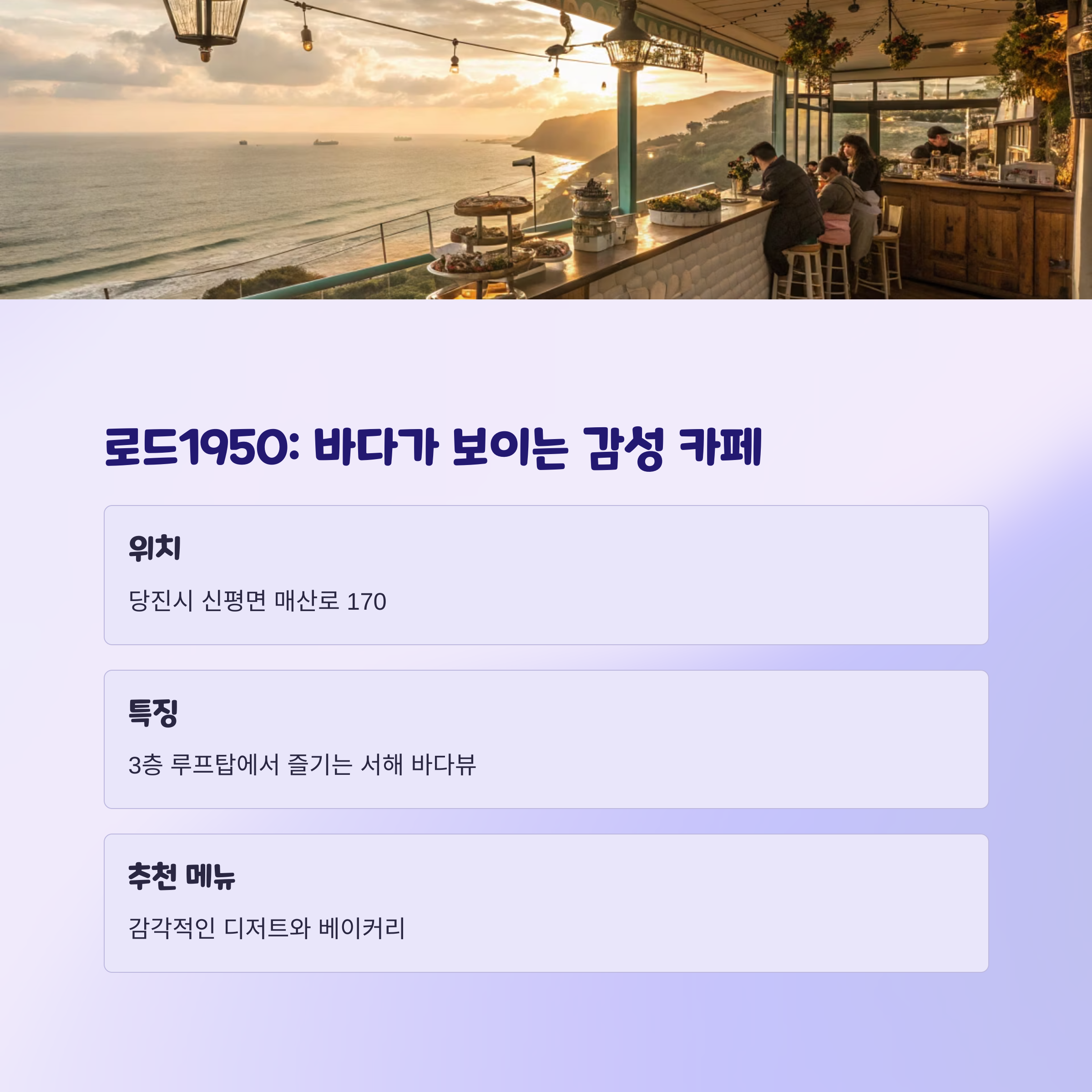 | 바다뷰를 완벽하게 즐길 수 있는 곳은 ""로드1950"" 카페입니다. 3층 테라스는 서해 바다를 한눈에 감상할 수 있는 명소입니다. 감각적인 인테리어와 더불어 포토존이 많아 사진 찍기에 최고의 장소입니다. 계절마다 다양한 이벤트가 열려 방문객들에게 특별한 경험을 제공합니다. 서해안고속도로 인근으로 서울에서도 약 1시간 거리로 접근성이 좋습니다. |