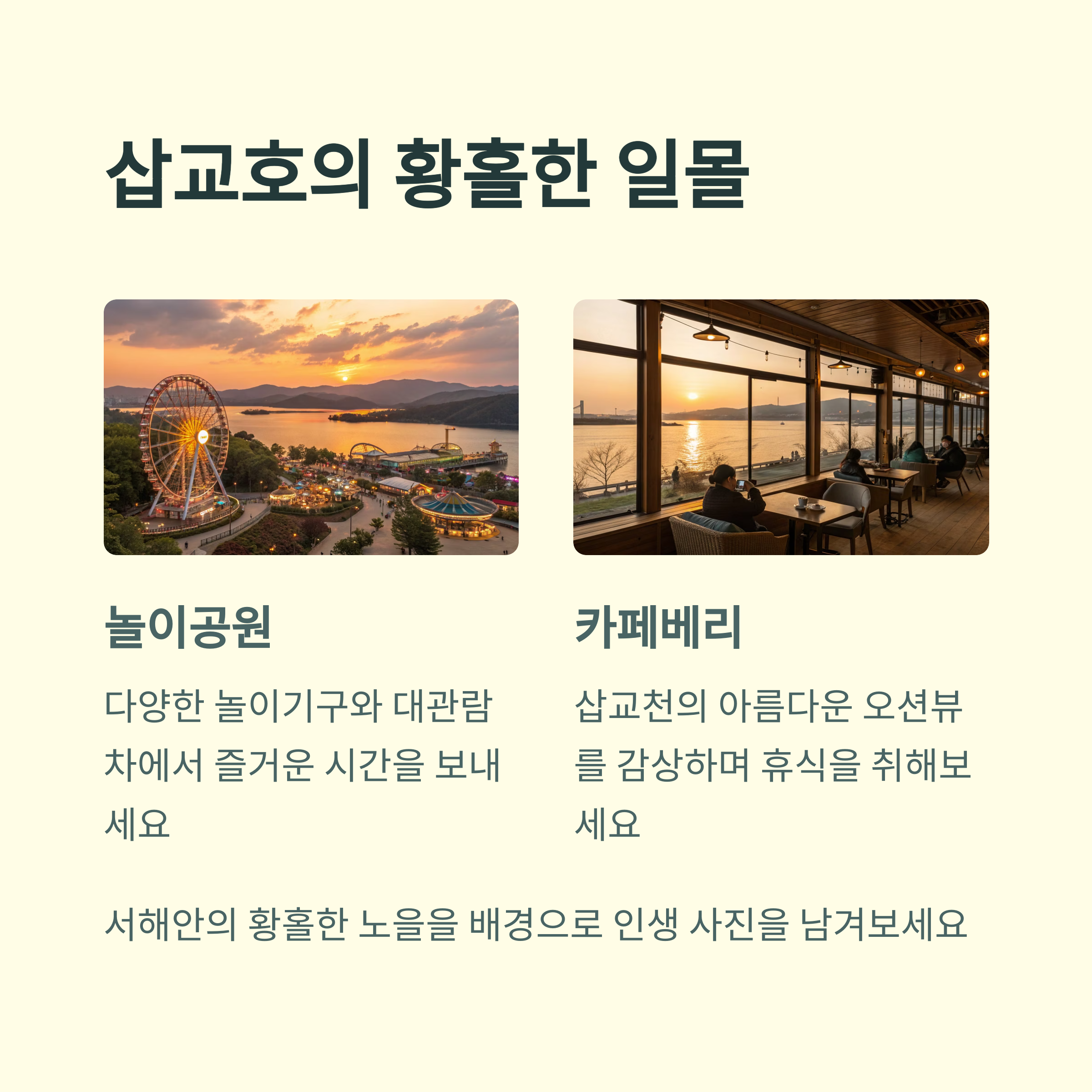 반면 삽교호는 해양과 평야의 아름다움을 함께 느낄 수 있는 곳으로, 놀이공원의 즐거움까지 더해집니다.