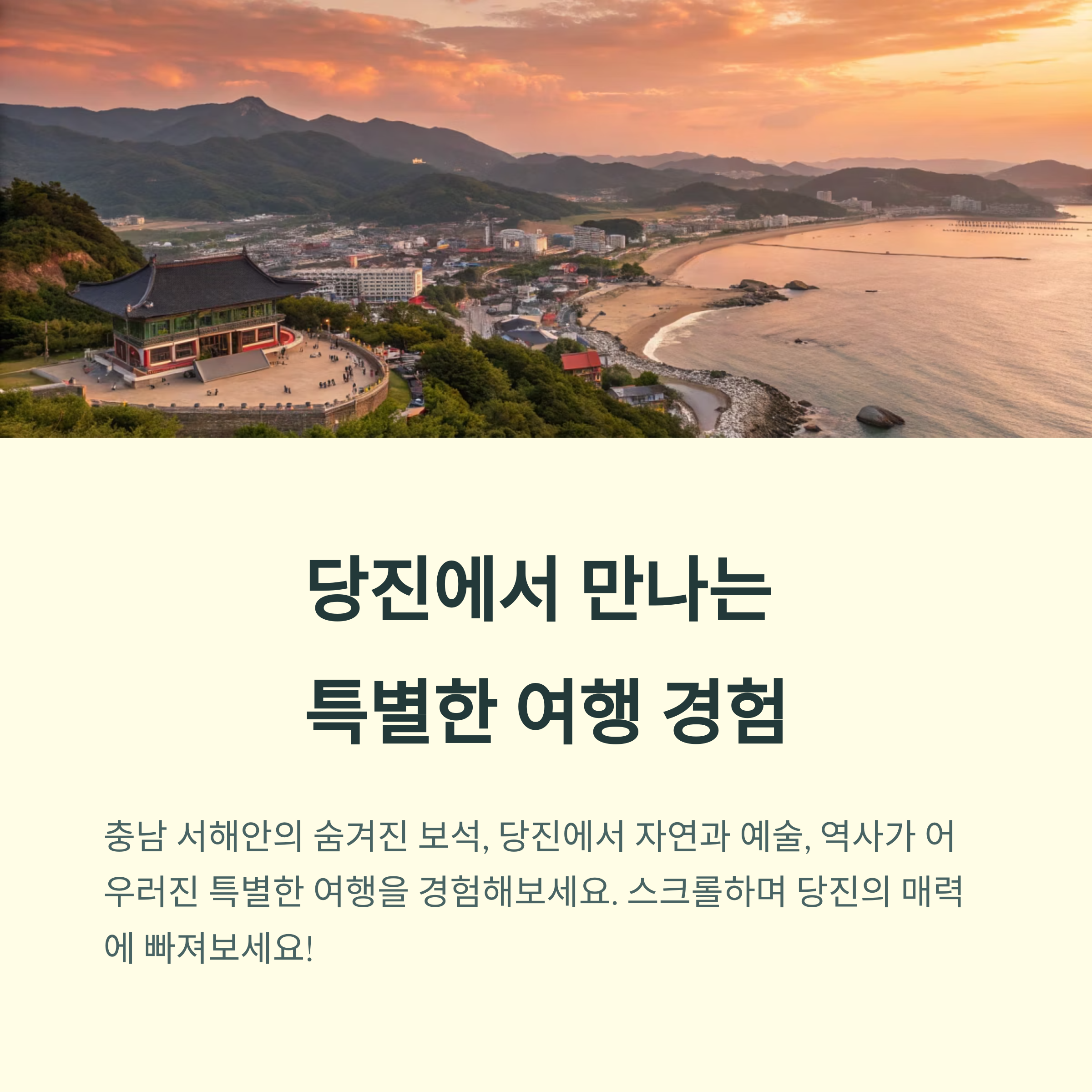 충남 서해안의 아름다움 속으로 한 걸음 더 들어가 보세요. 자연과 역사가 조화를 이루는 당진에서의 하루, 즐거움만 가득할 거예요!