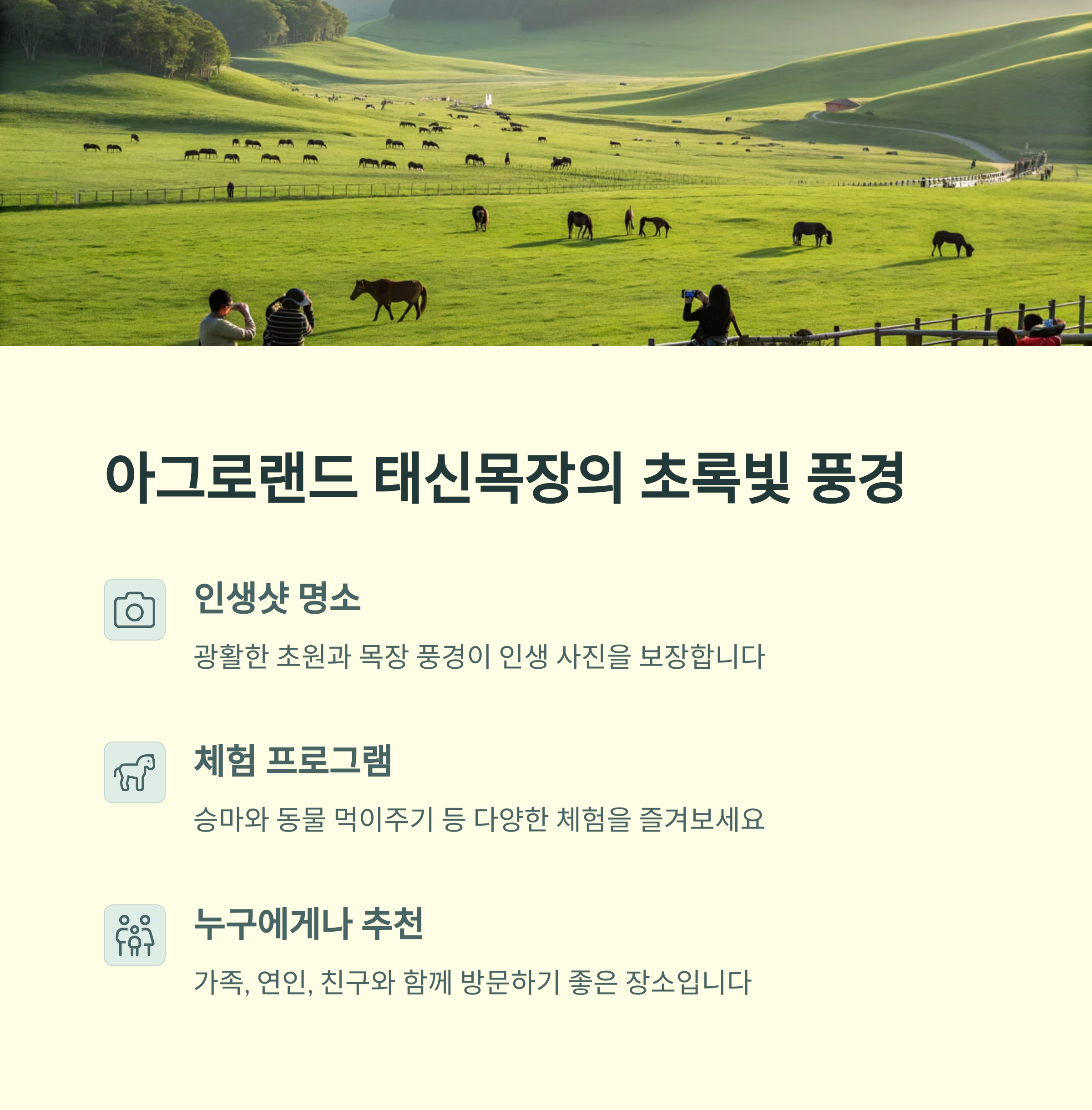 | 아그로랜드 태신목장 | 국내 최대 규모의 자연 목장 | 광활한 초원과 조형물 | 자연과 힐링 |