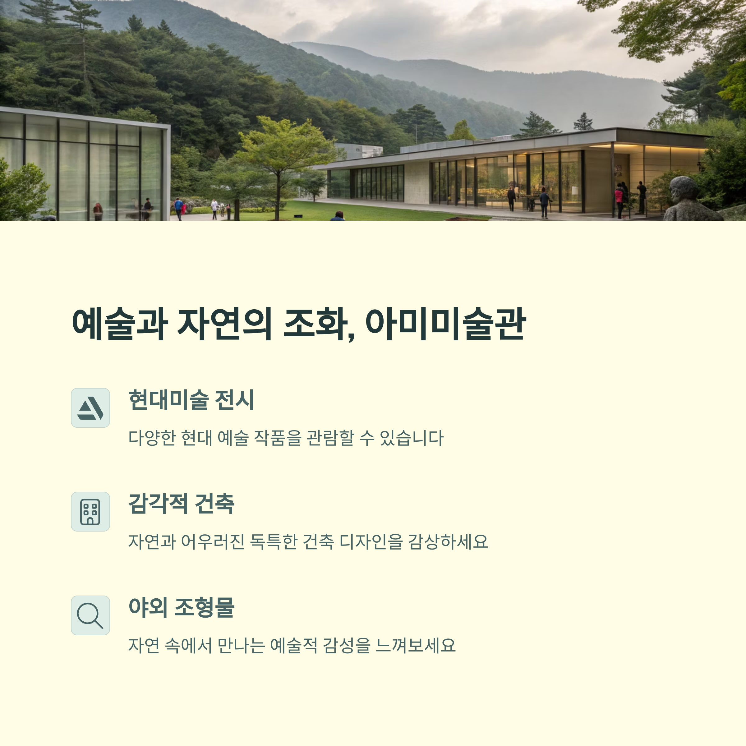 아미미술관은 자연을 배경으로 해서 더 특별한 예술적 경험을 제공합니다.