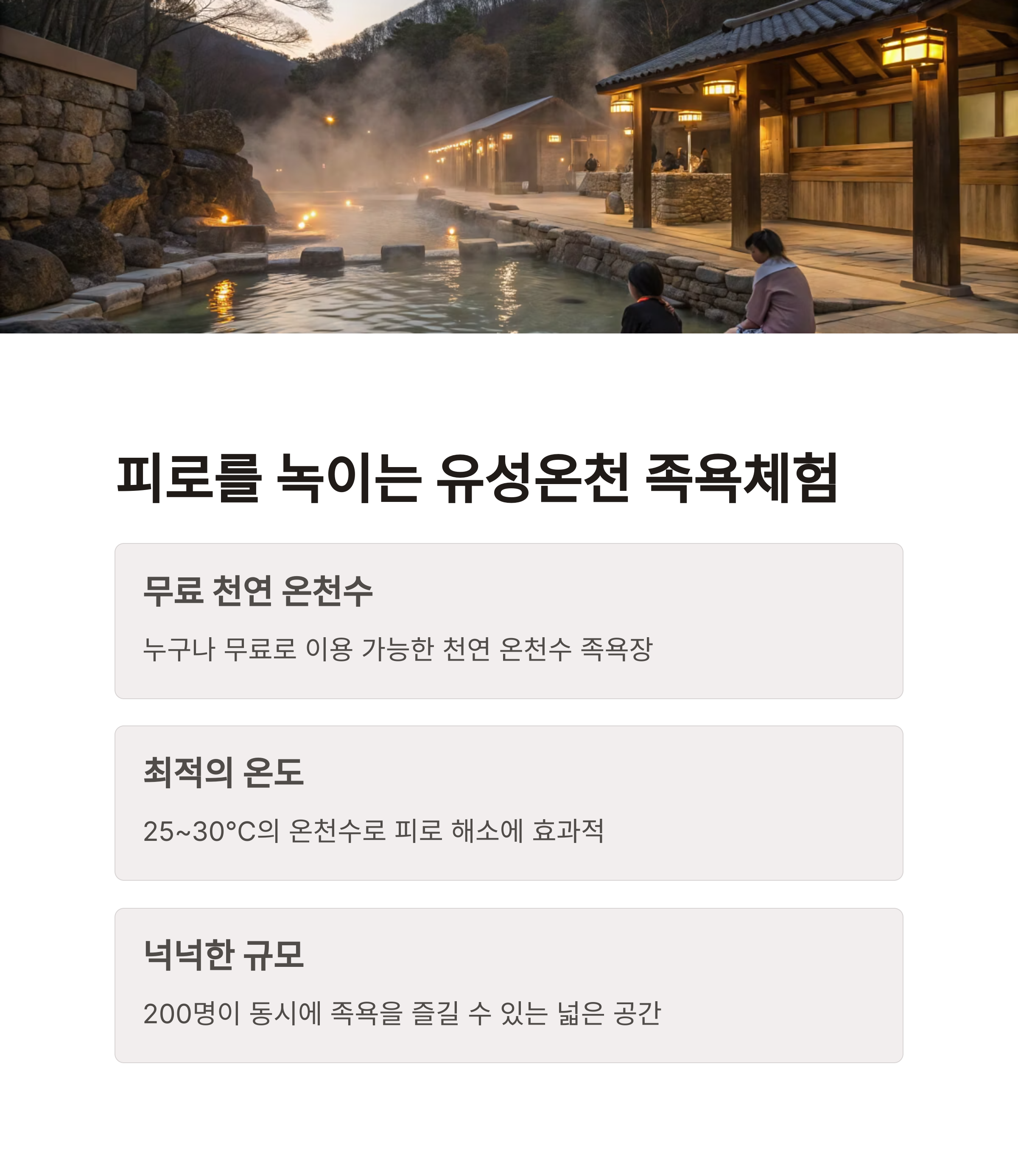 유성온천은 춥거나 선선한 계절에 방문하기 좋습니다. 온천 족욕 체험은 겨울철 피로 회복과 혈액 순환에 도움을 줍니다.