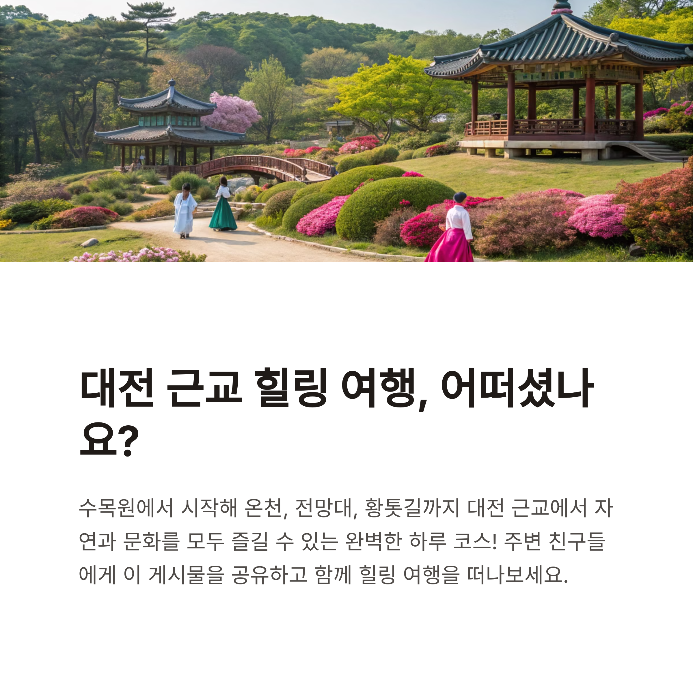 안녕하세요, 유노이안입니다. 오늘은 대전 근교에서 힐링하며 즐길 수 있는 하루 당일치기 여행 코스를 소개하려고 합니다.